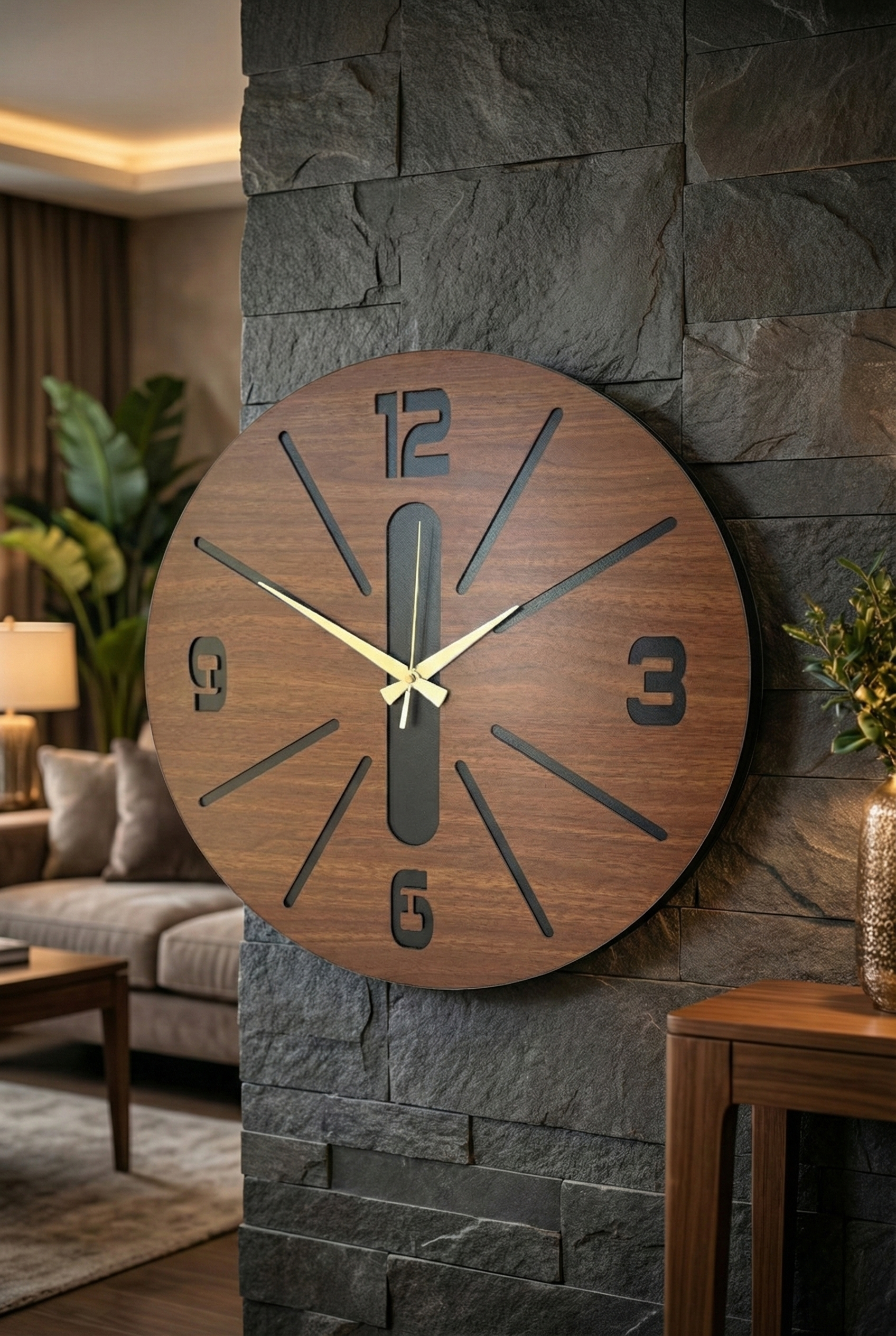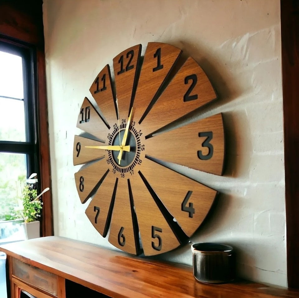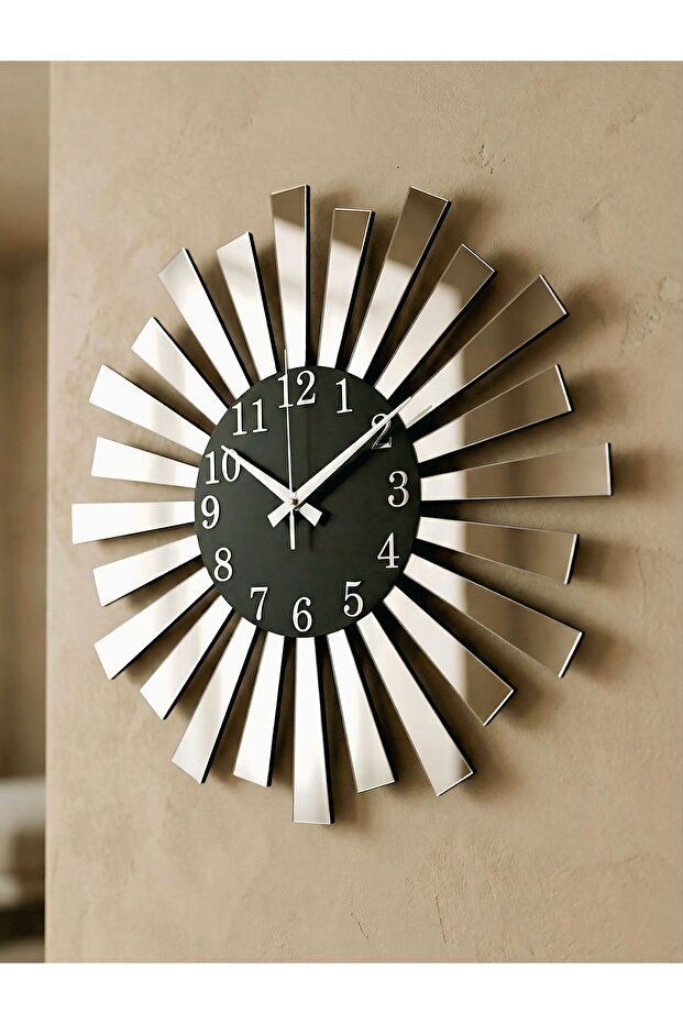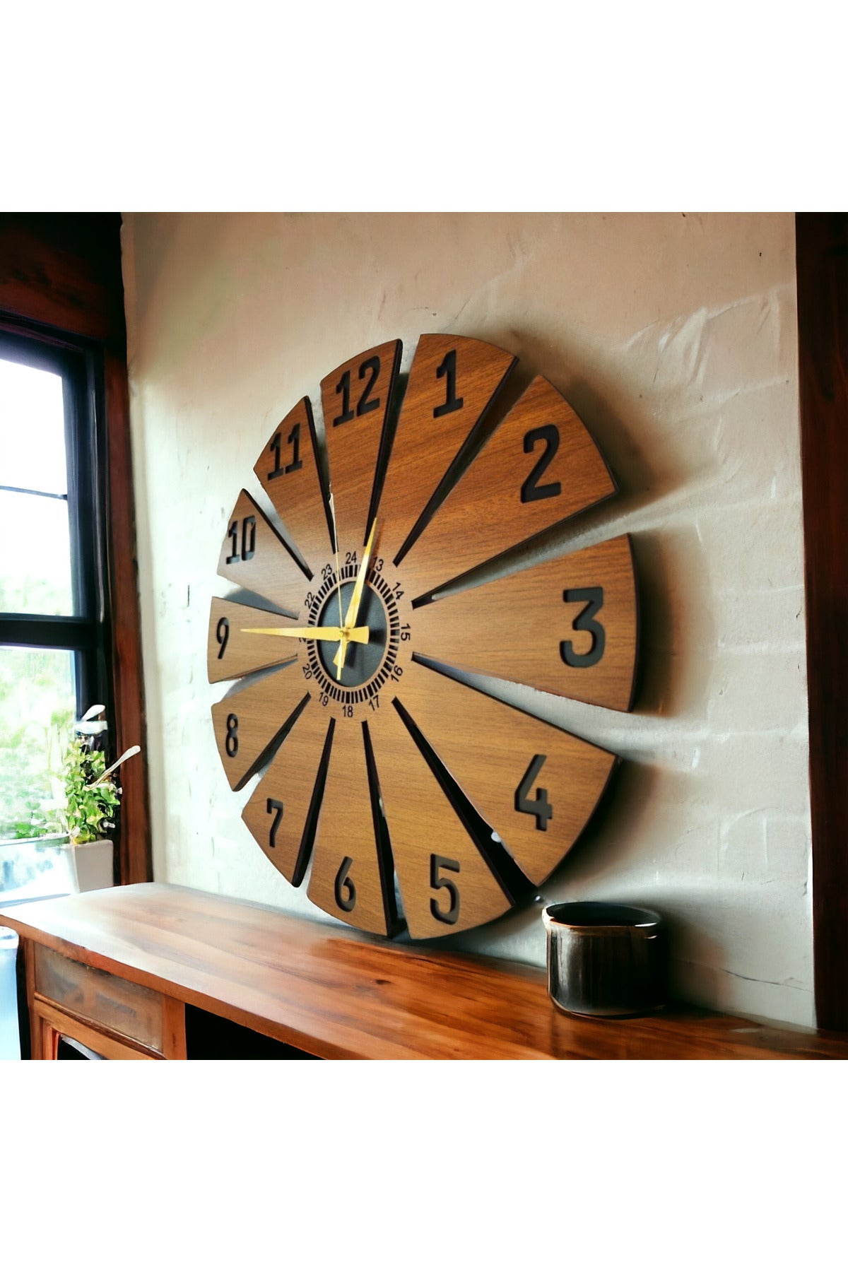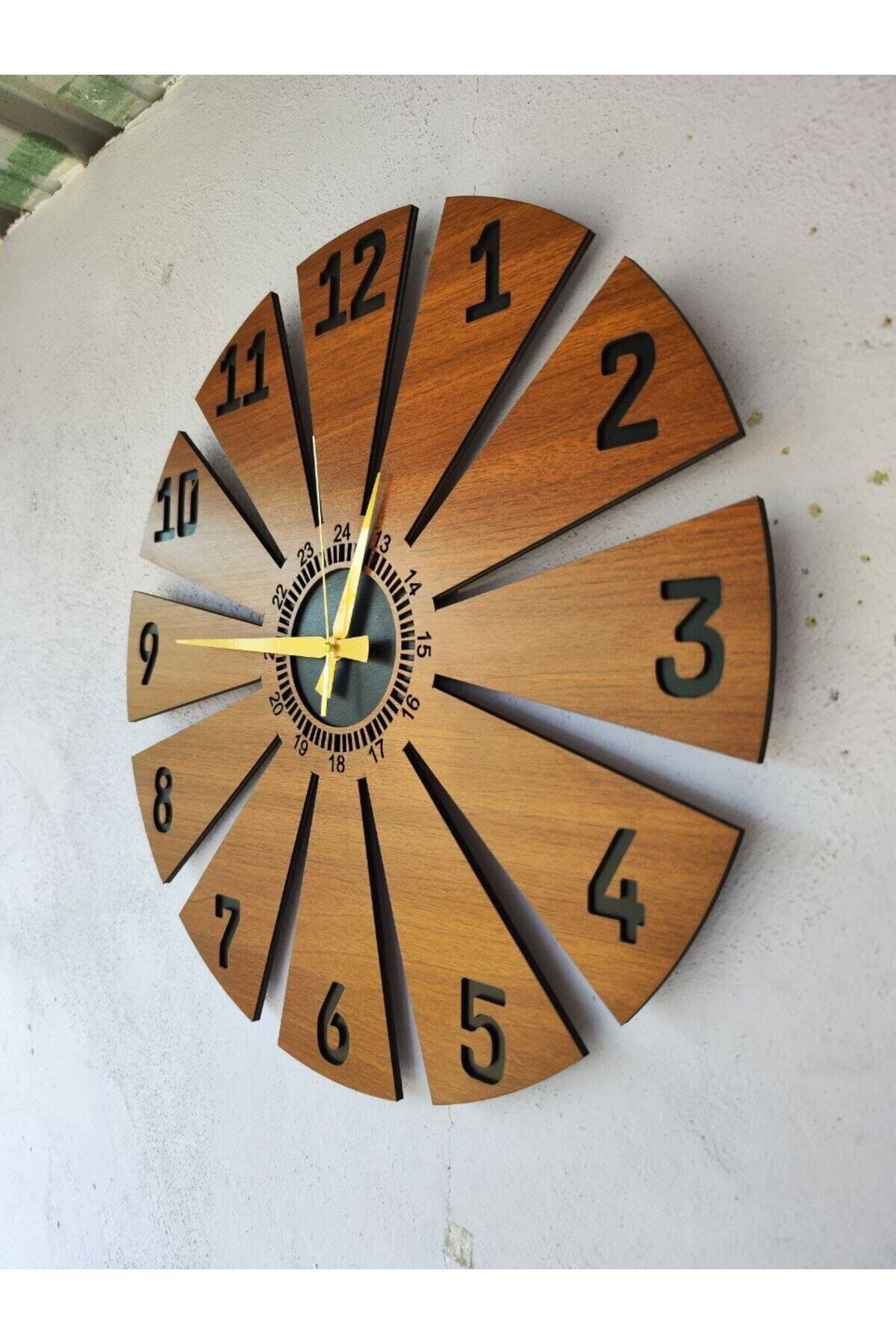 - Modern tasarımıyla dikkat çeken bu duvar saati, evinizin dekorasyonuna şık bir dokunuş ekler.; - Ceviz rengi ve asimetrik şekliyle göz alıcı bir görünüm sunar, mekanınıza sıcak ve doğal bir hava katar.; - 50 cm çapındaki geniş boyutu ile hem büyük duvarlarda hem de küçük alanlarda rahatlıkla kullanılabilir.; - Sessiz çalışma özelliği sayesinde gürültüsüz bir ortamda zamanı takip etmenizi sağlar.