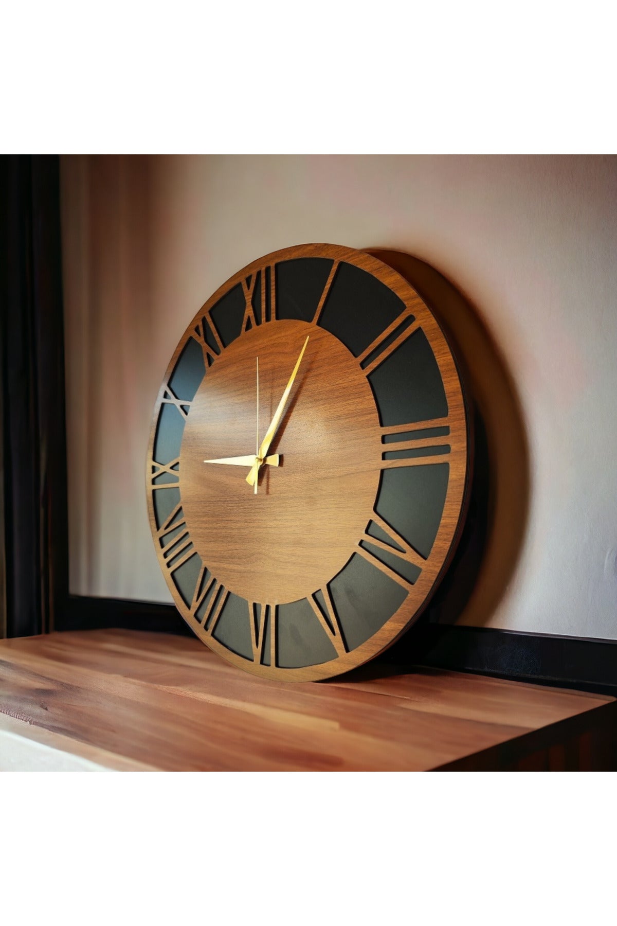 Ahşap Ceviz Mobilya Renk Roma Rakam Desenli Hediyelik Sessiz Duvar Saati 50cm