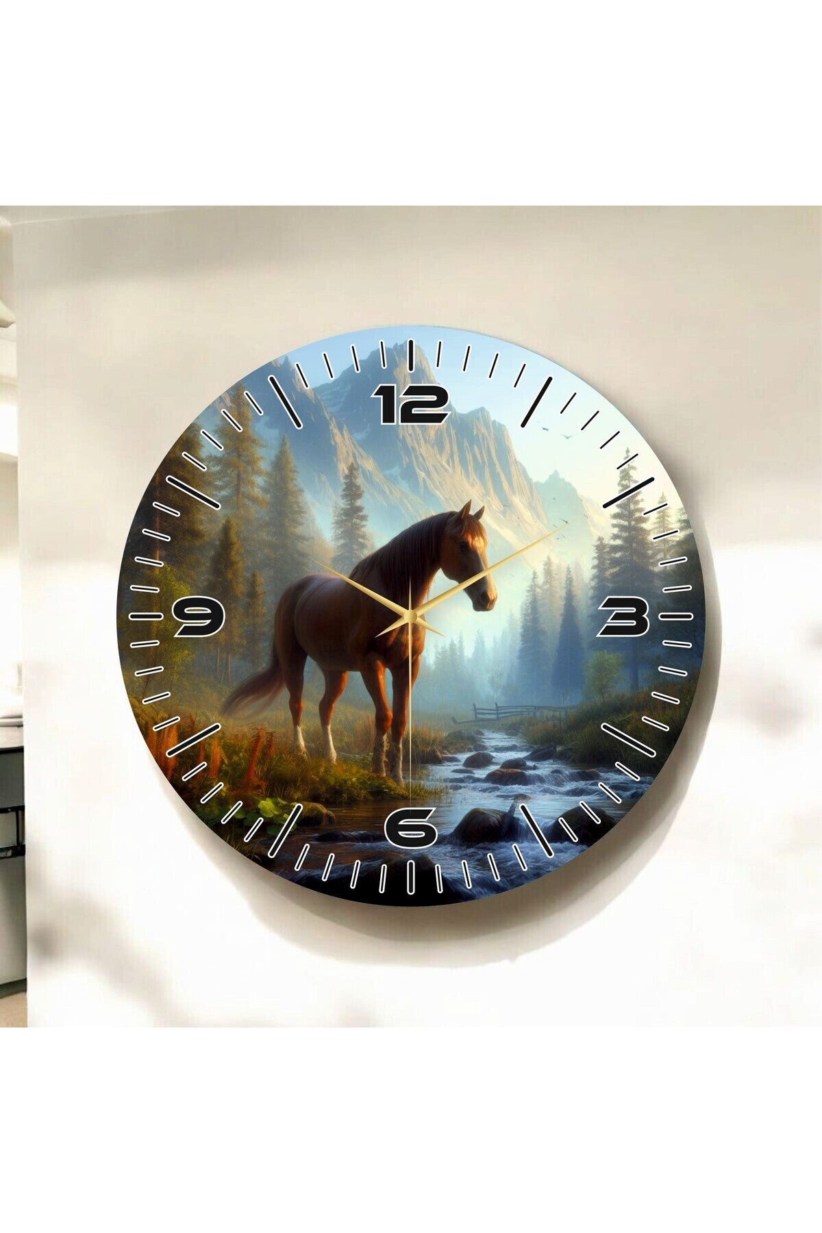 At ve Manzara Fotoğraflı Renkli Baskı Desenli Sayılı Hediyelik Ahşap Sessiz Tablo Duvar Saati