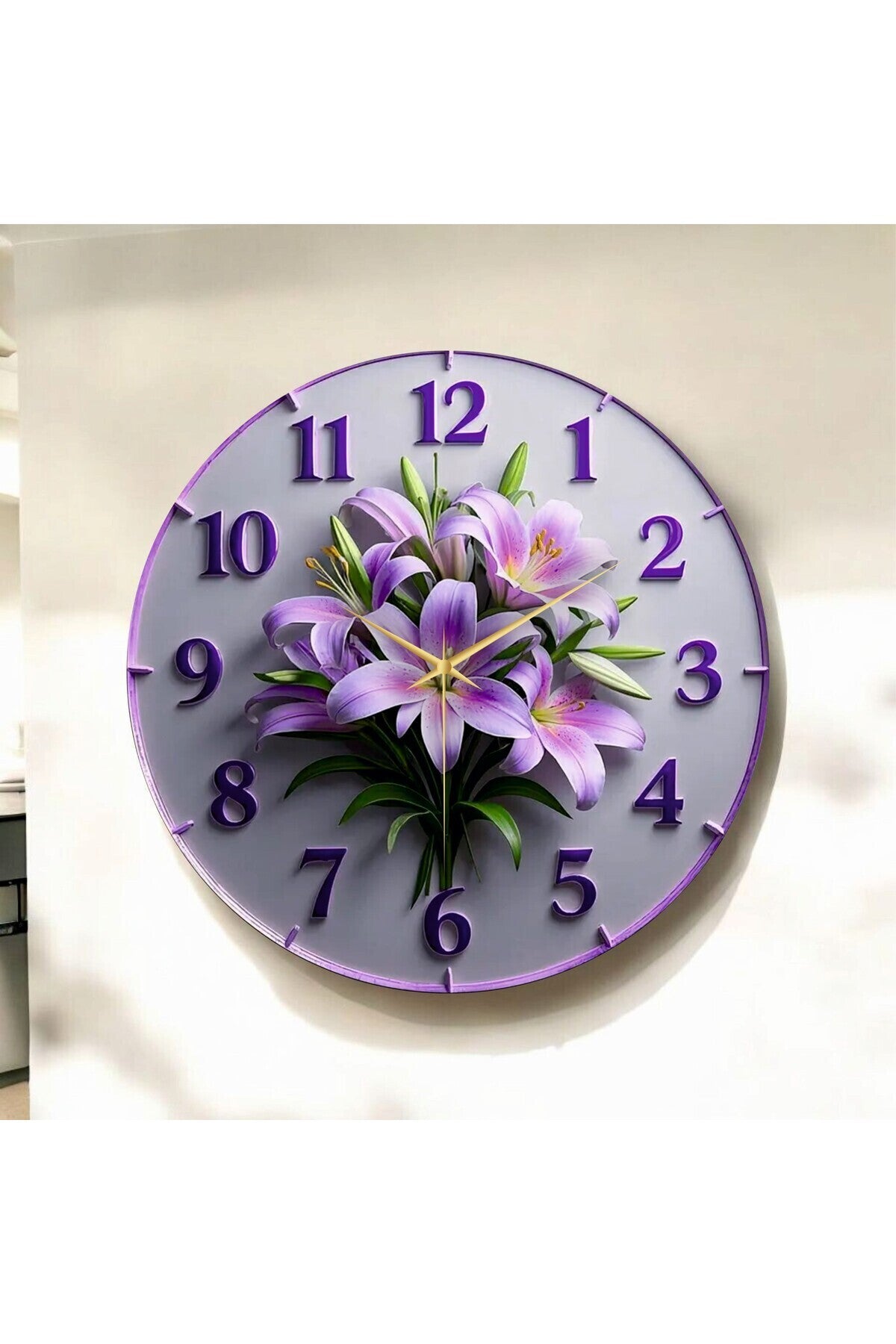 Çiçek Kabartma Görünümlü Mor Renkli Baskı Desenli Sayılı Hediyelik Ahşap Sessiz Duvar Saati