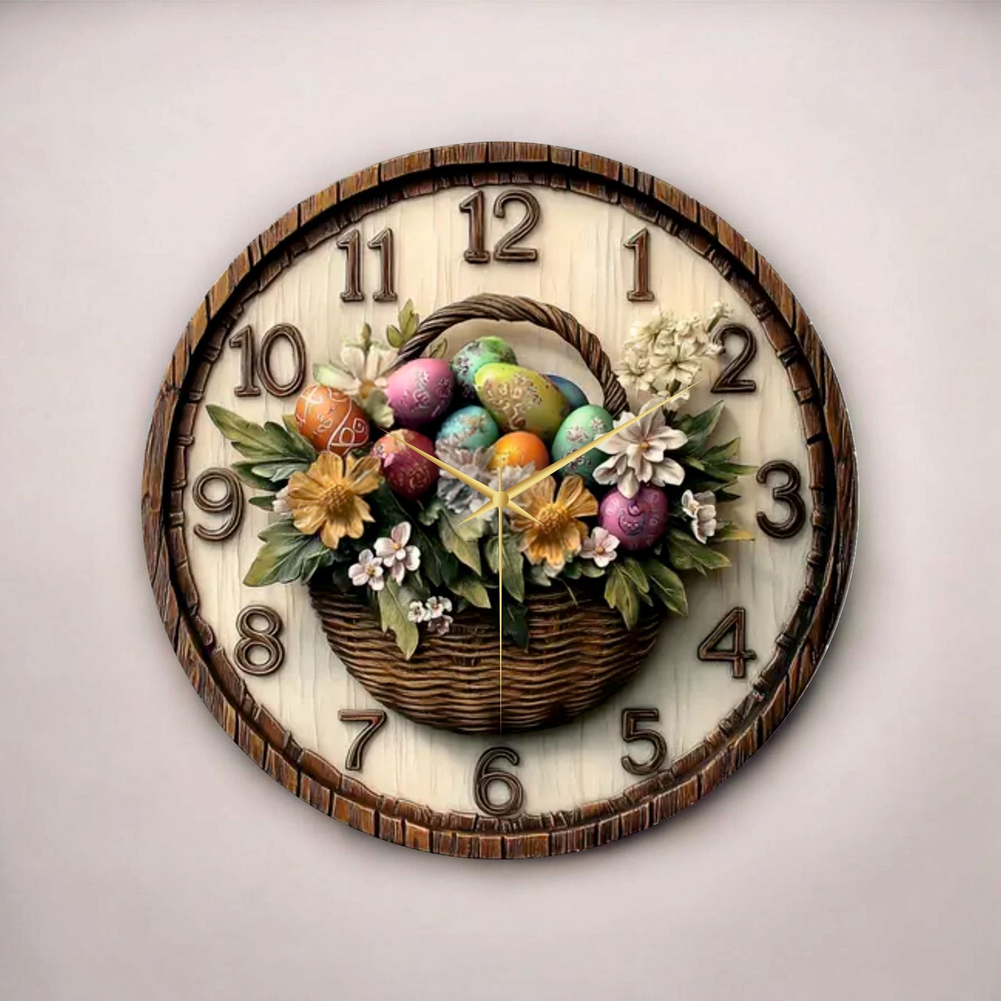 Çiçek Sepeti Kabartma Görünümlü Renkli Baskı Desenli Sayılı Hediyelik Ahşap Sessiz Duvar Saati