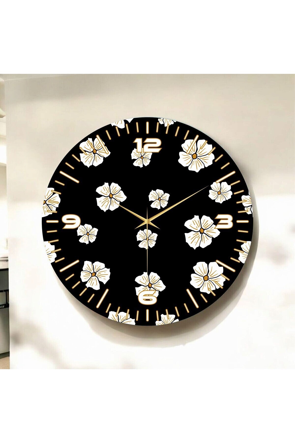 Çiçek Temalı Siyah Renkli Baskı Papatya Desenli Sayılı Hediyelik Ahşap Sessiz Tablo Duvar Saati