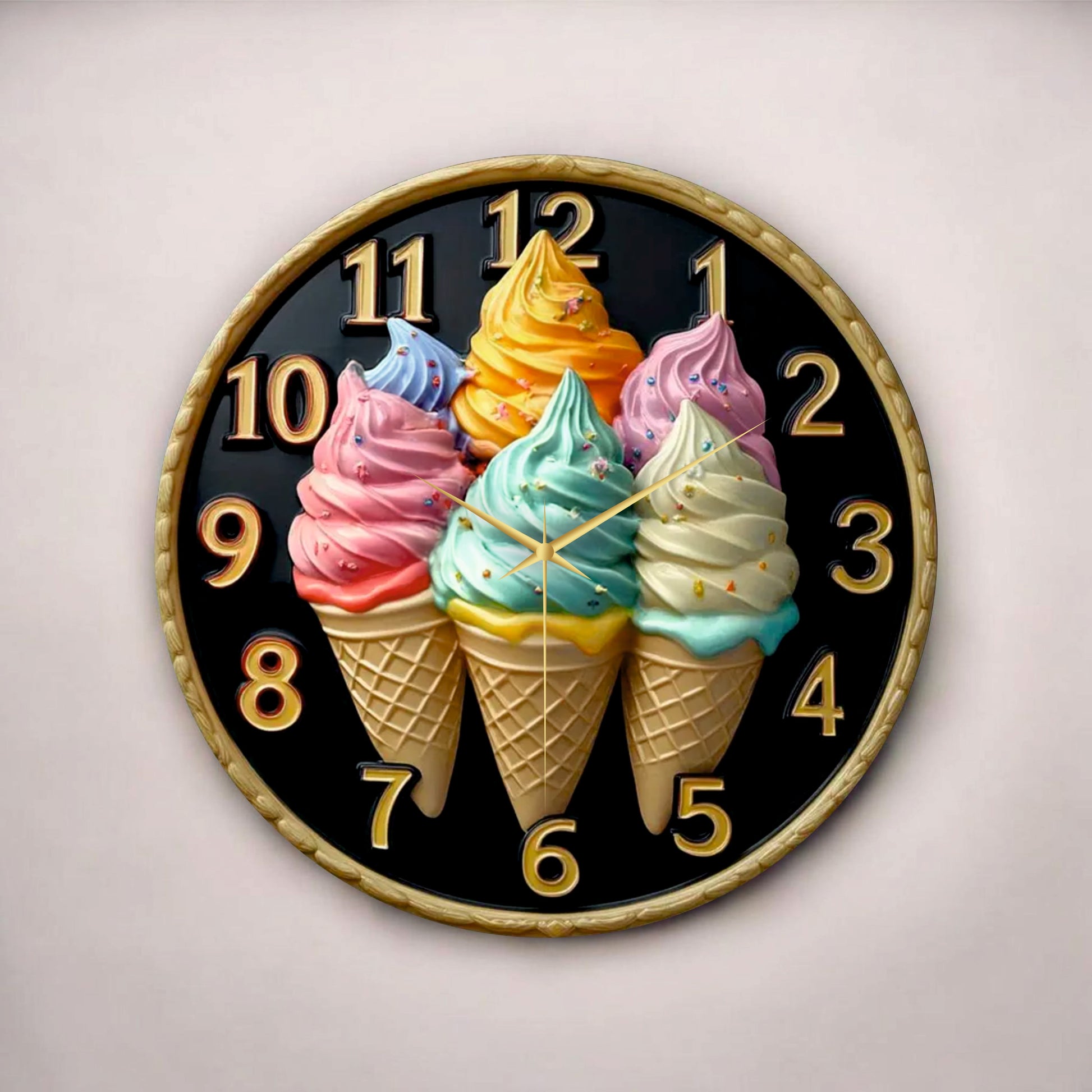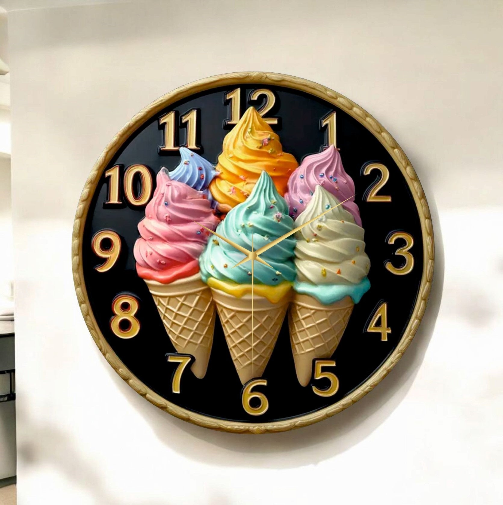 Dondurma Kabartma Görünümlü Renkli Baskı Desenli Sayılı Hediyelik Ahşap Sessiz Duvar Saati