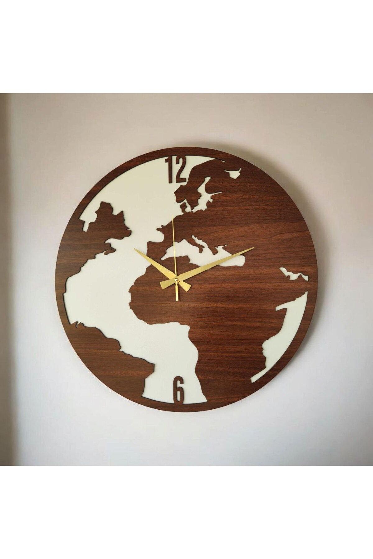 Dünya Haritası Ahşap Ceviz Siyah Renk Sade Sayılı Hediyelik Sessiz Duvar Saati 50cm