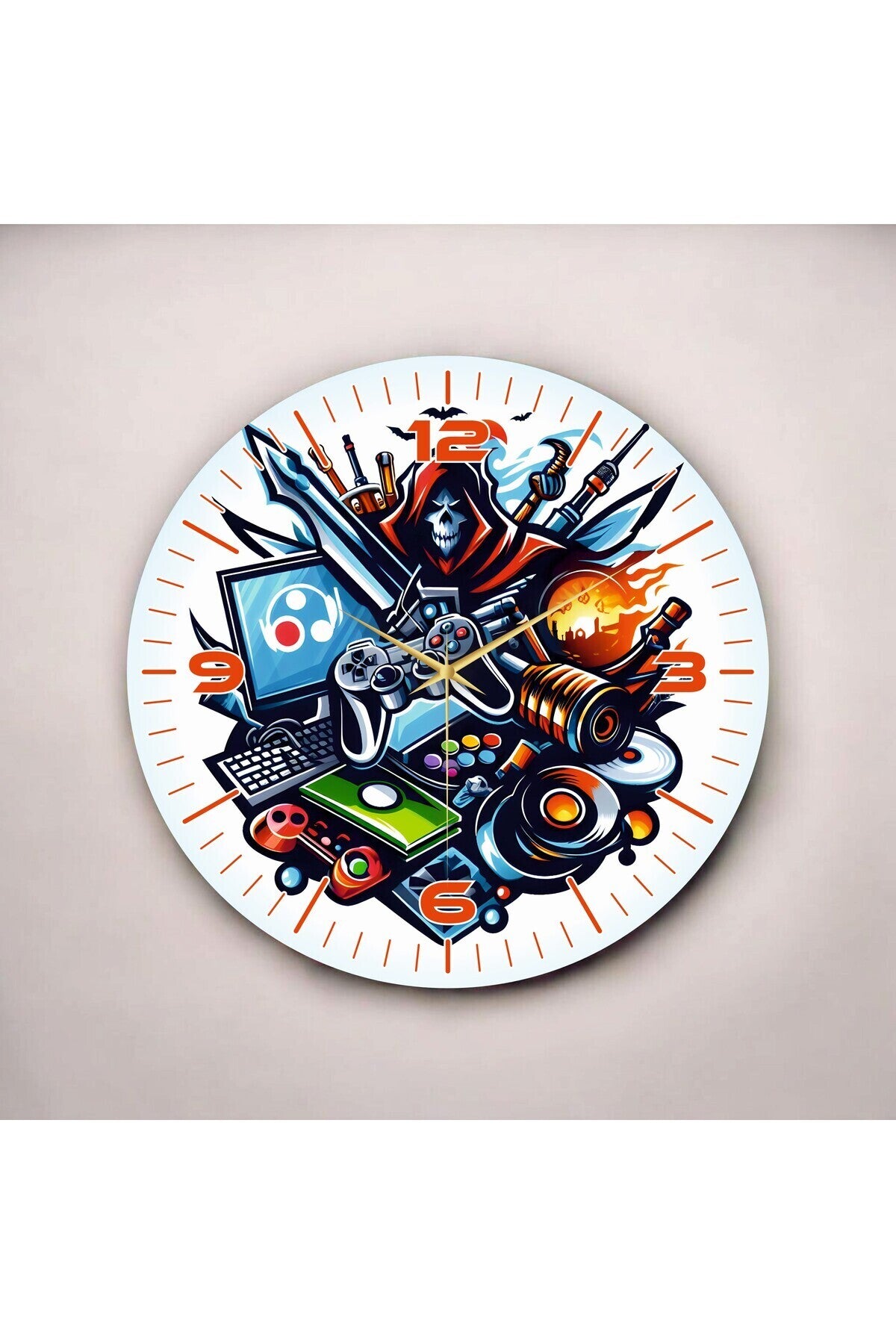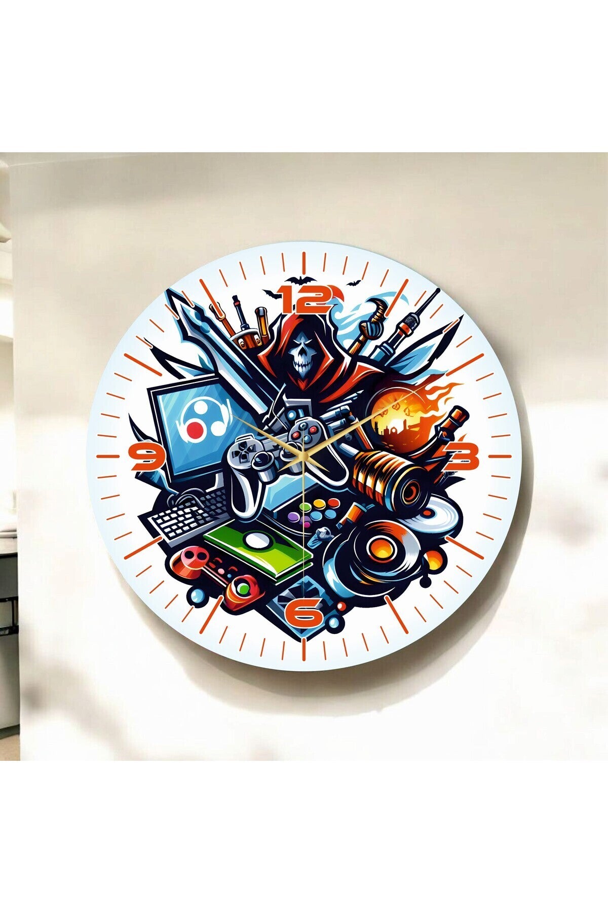 Gamer Tasarımlı Renkli Baskı Desenli Sayılı Hediyelik Ahşap Sessiz Tablo Duvar Saati