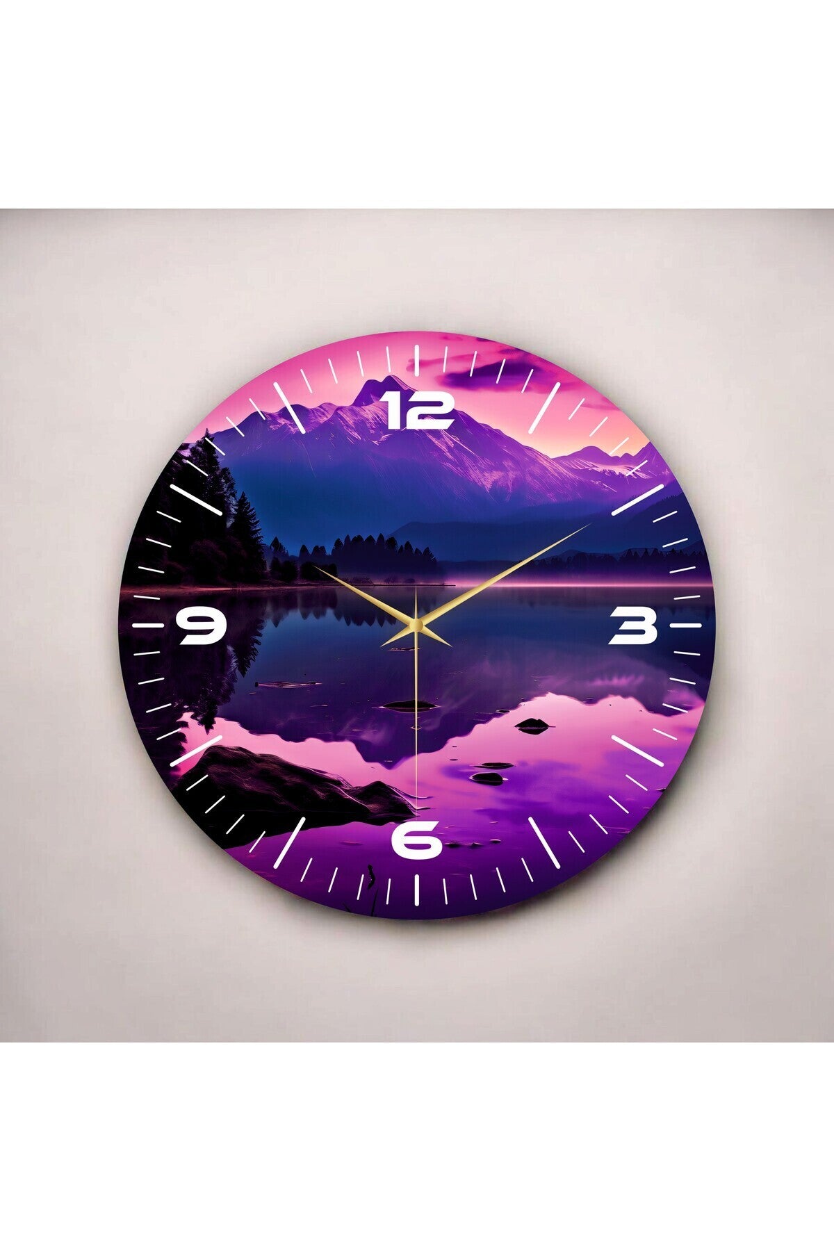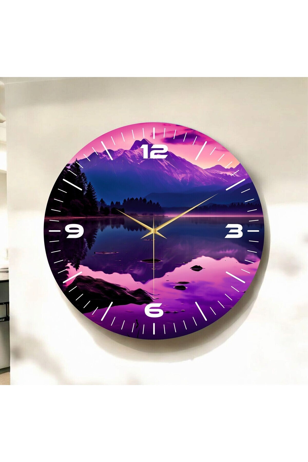 Göl Manzaralı Mor Renkli Baskı Desenli Sayılı Hediyelik Ahşap Sessiz Tablo Duvar Saati