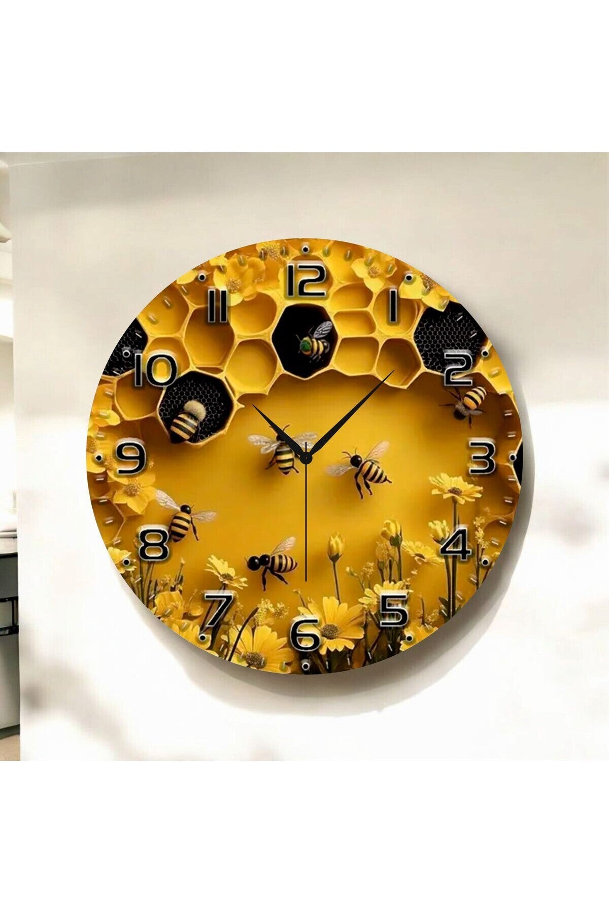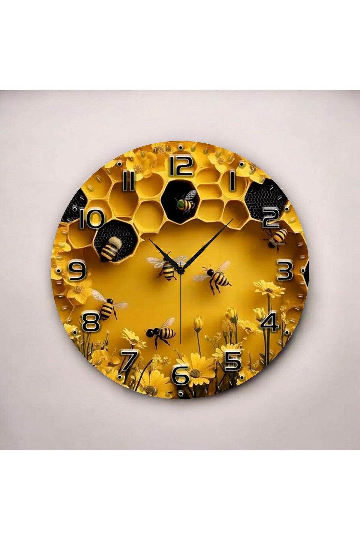 Kabartma Görünümlü Renkli Baskı Arı Desenli Sayılı Hediyelik Ahşap Sessiz Tablo Duvar Saati