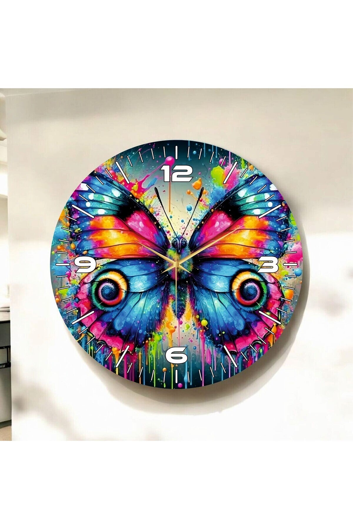 Kelebek Hayvan Renkli Baskı Desenli Sayılı Hediyelik Ahşap Sessiz Tablo Duvar Saati 50cm