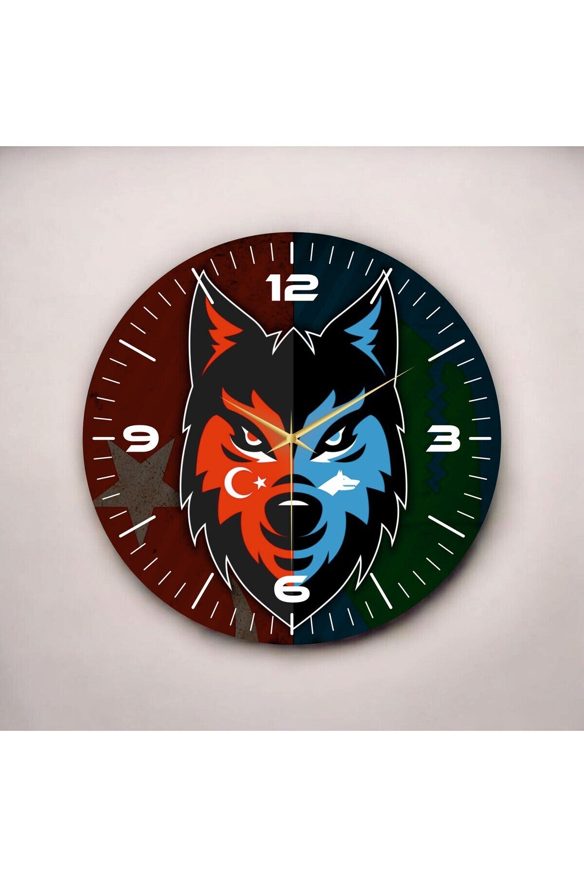 - Sarı mavi renklerdeki bozkurt ve Türk bayrağı desenleriyle, evinizin veya ofisinizin dekorasyonuna şıklık katar.; - 45cm çapında geniş tasarımıyla dikkat çekici bir görünüm sunar ve duvarlarınıza modern bir dokunuş ekler.; - Pilli çalışma tipi sayesinde elektrik bağlantısına ihtiyaç duymadan kolayca kullanabilirsiniz; pratiklik sağlar.; - Modern tema ve stil anlayışı ile çağdaş dekorasyon trendlerine uyum sağlar ve mekanınıza dinamik bir hava katar.; - Türkiye menşeli olması gurur verici bir detaydır; yerel sanat ve tasarımın özgün örneklerini yansıtır.; - Web color özelliği ile canlı renklerin mükemmel uyumu, herhangi bir ortama enerji katmak için idealdir.; - Yuvarlak şekli sayesinde standart duvar alanlarına rahatça monte edilebilir ve estetik bir bütünlük oluşturur.; - Dayanıklı ahşap materyali uzun ömürlü kullanım vaat ederken aynı zamanda sıcak ve doğal bir atmosfer yaratır.