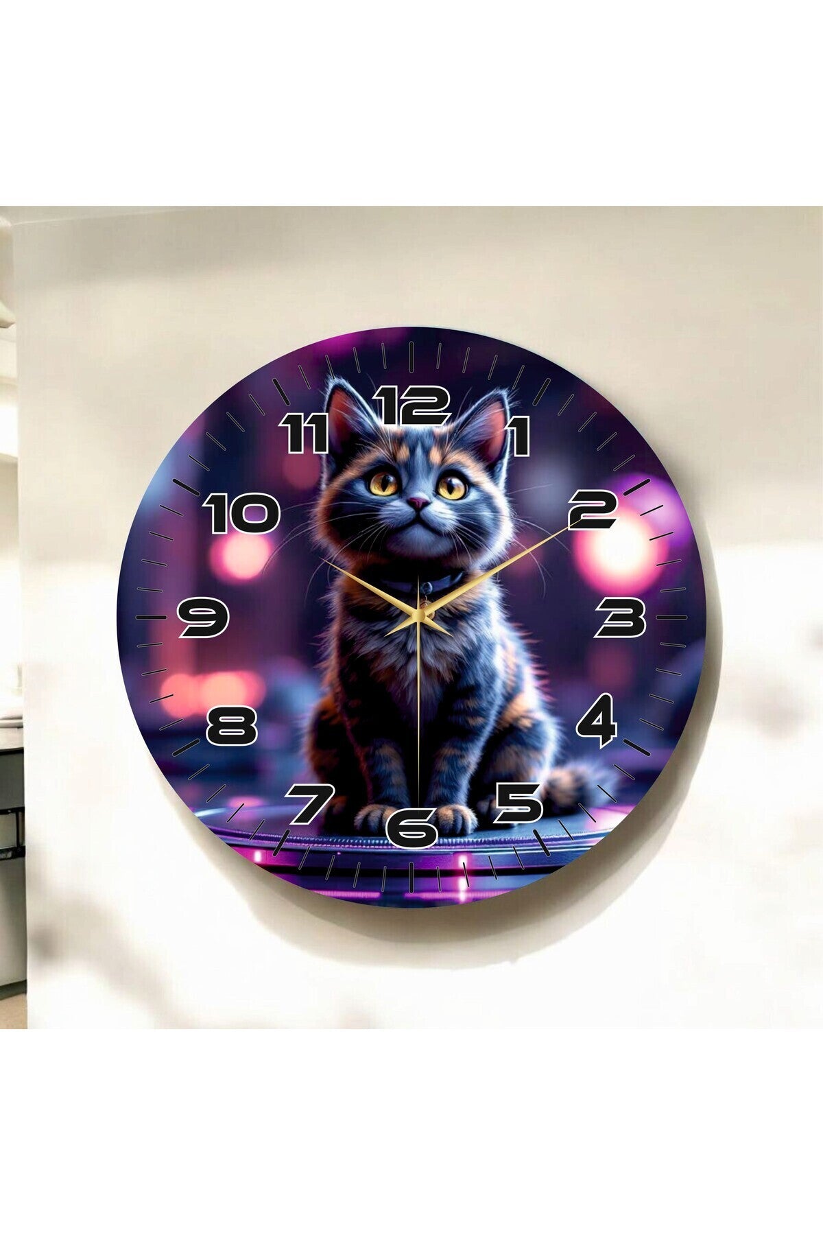 Koyu Renkli Baskı Kedi Desenli Sayılı Hediyelik Ahşap Sessiz Tablo Duvar Saati