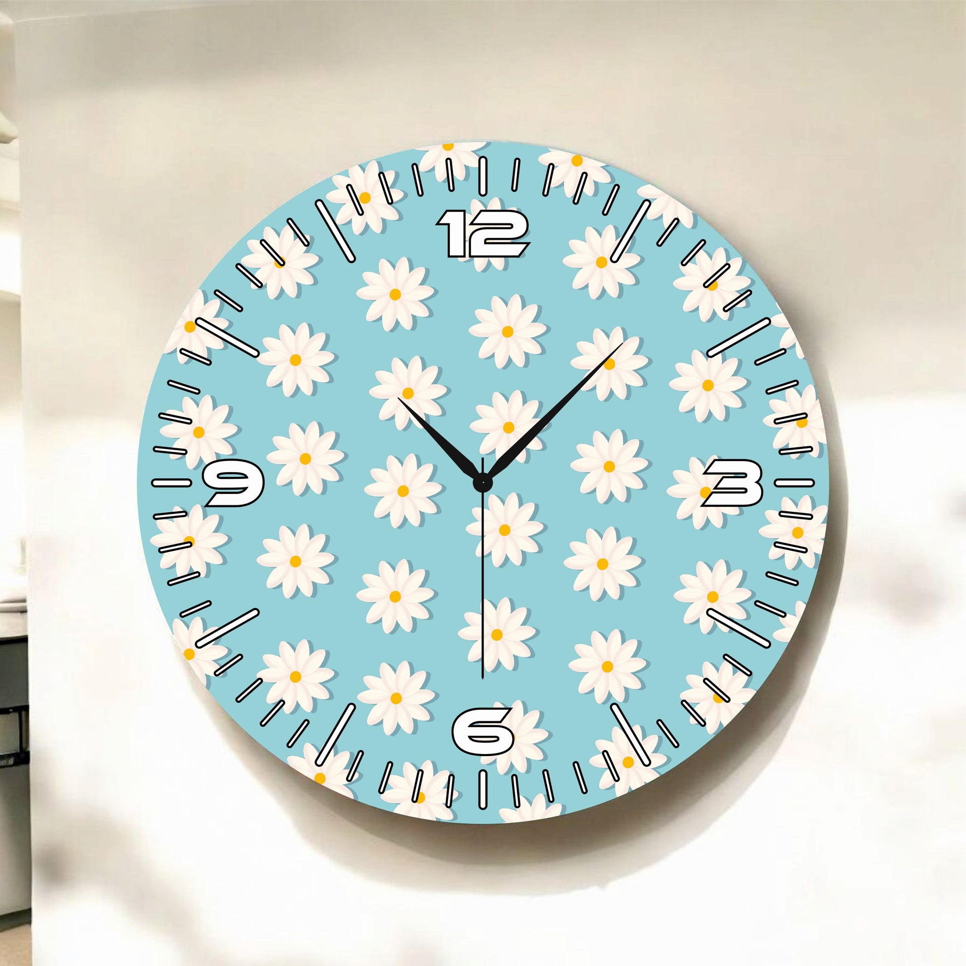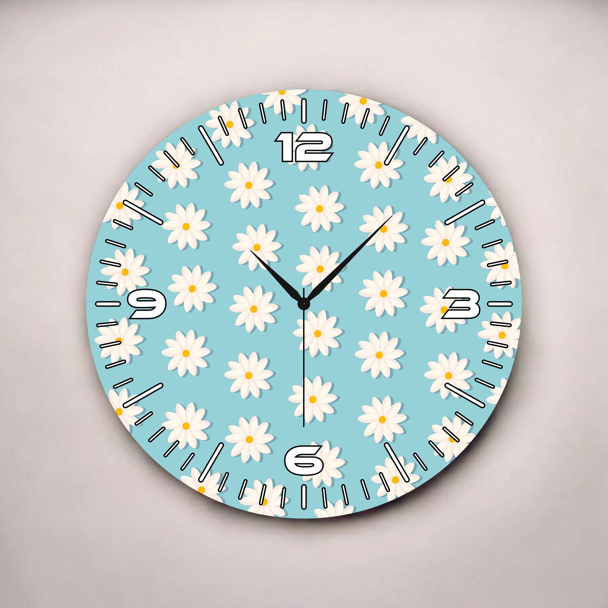 Mavi Renkli Baskı Papatya Çiçek Desenli Sayılı Hediyelik Ahşap Sessiz Tablo Duvar Saati
