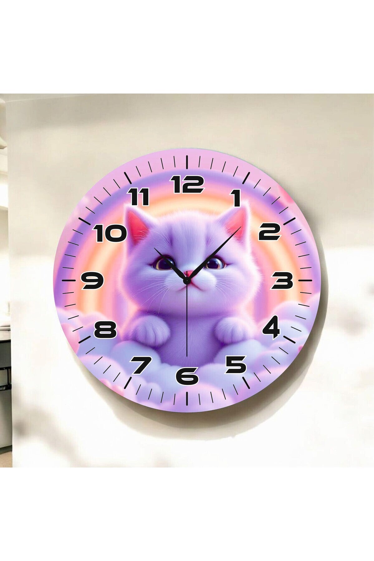 Mor Renkli Baskı Kedi Desenli Sayılı Hediyelik Ahşap Sessiz Tablo Duvar Saati