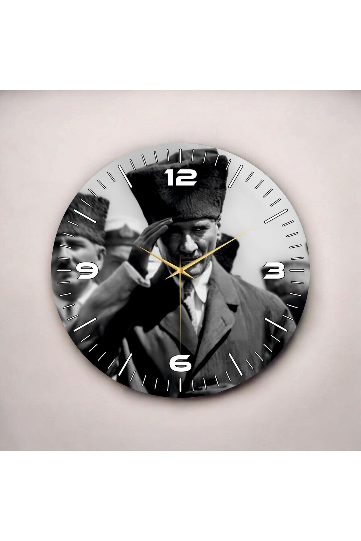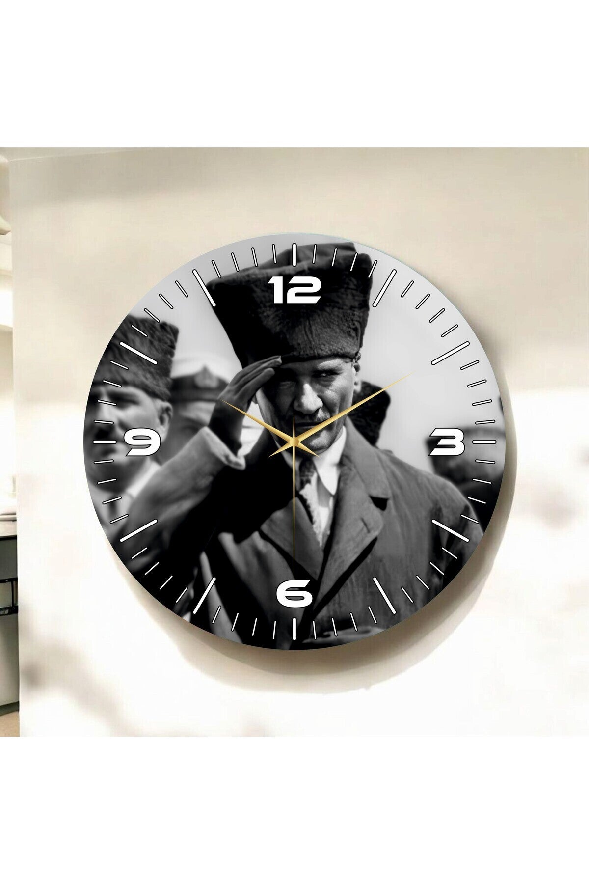 Mustafa Kemal Atatürk Siyah Beyaz Renkli Baskı Sayılı Hediyelik Ahşap Sessiz Tablo Duvar Saati