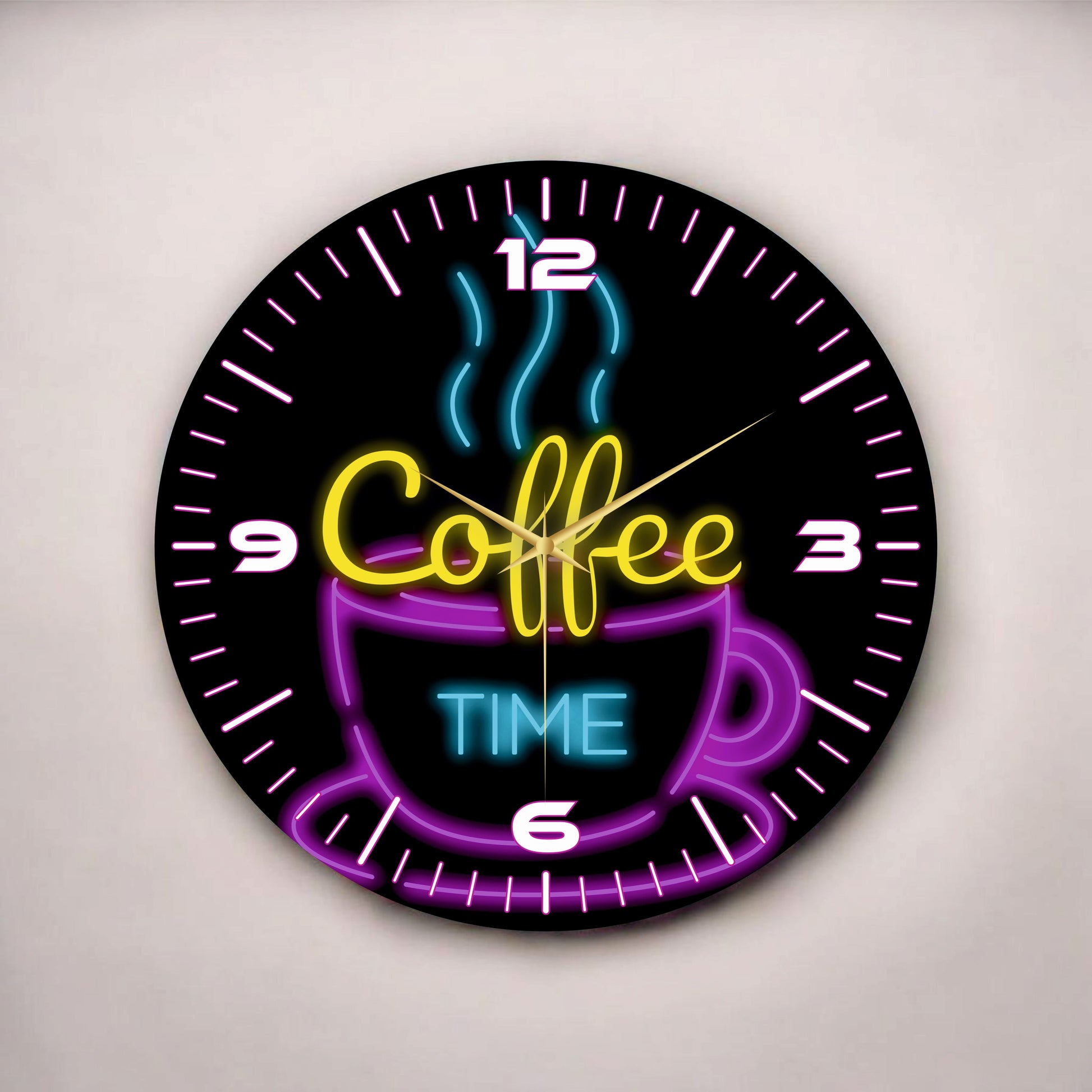 Neon Renkli Coffee Time Yazılı Baskı Desenli Sayılı Hediyelik Ahşap Sessiz Tablo Duvar Saati