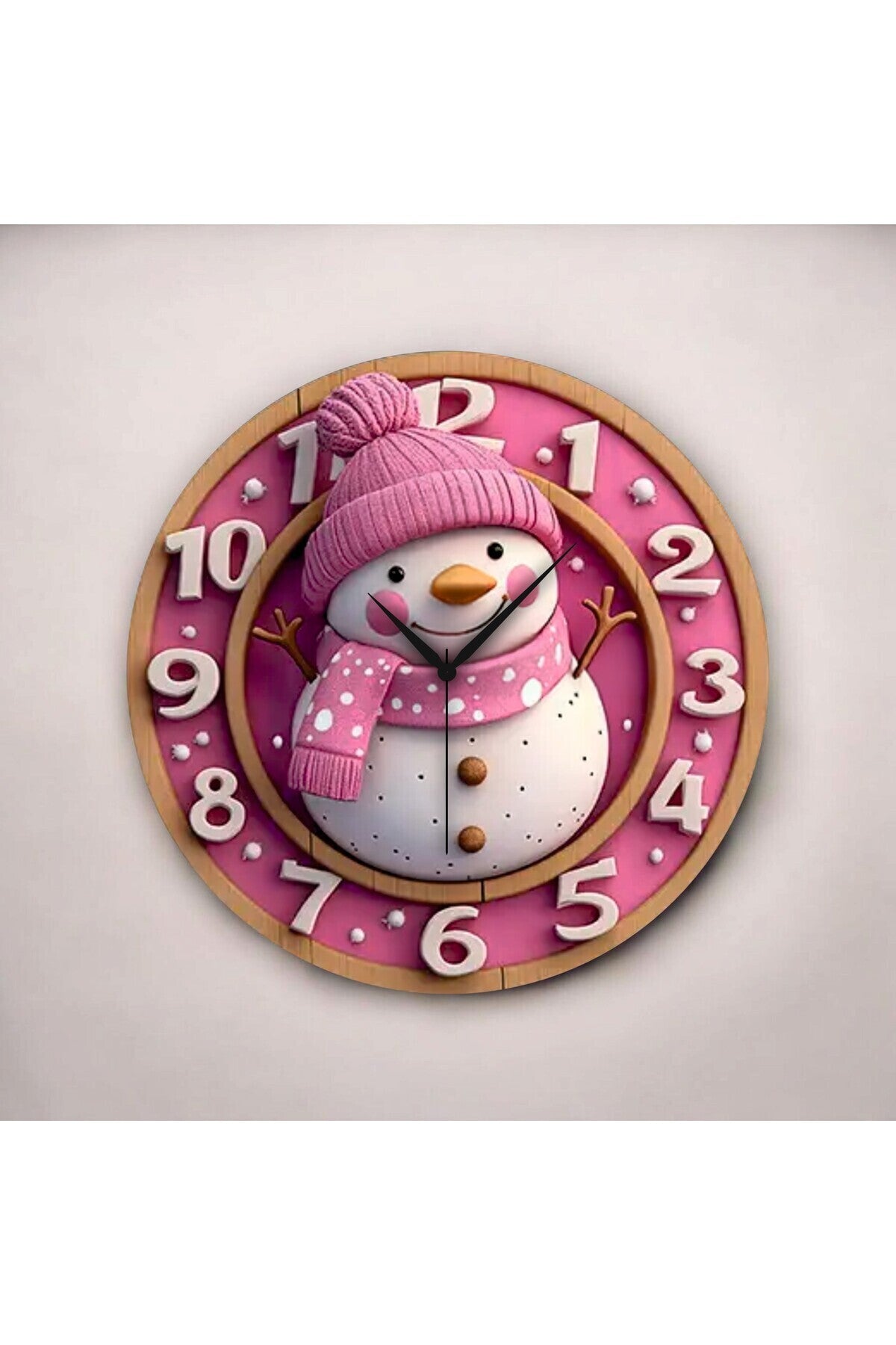 Pembe Kardan Adam Renkli Baskı Desenli Sayılı Hediyelik Ahşap Sessiz Tablo Duvar Saati