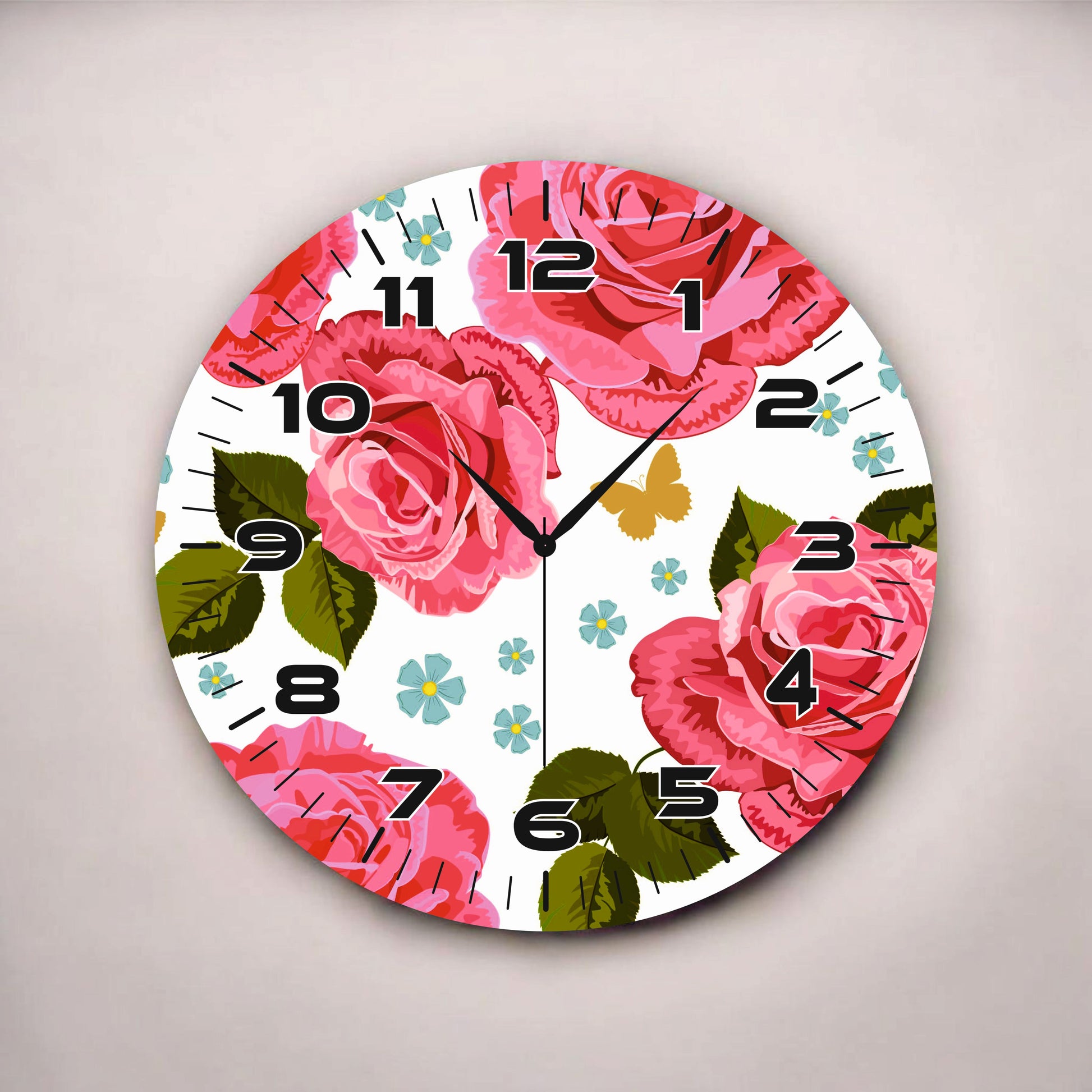 Pembe Renkli Baskı Gül Çiçeği Desenli Sayılı Hediyelik Ahşap Sessiz Tablo Duvar Saati