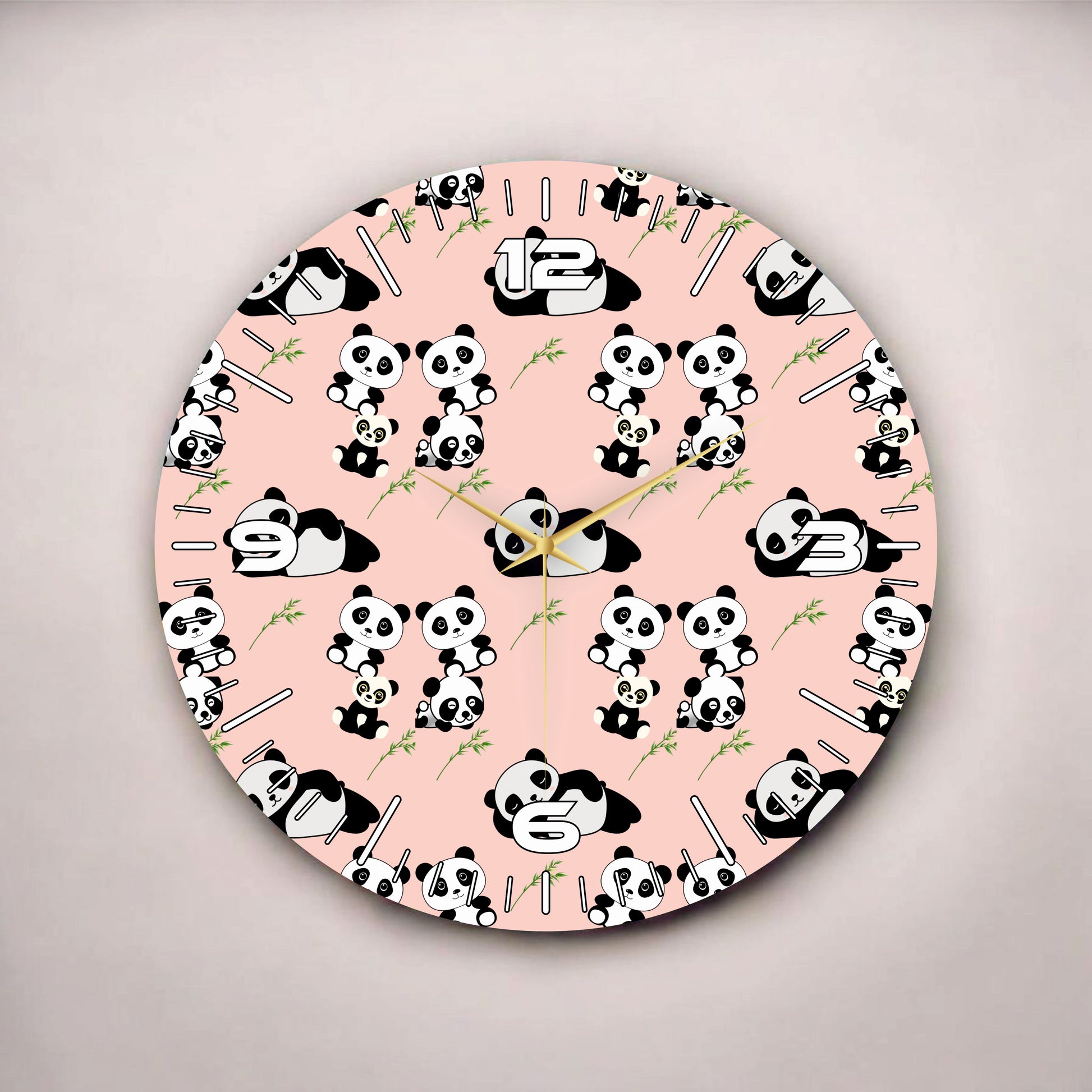 Pembe Renkli Baskı Panda Desenli Sayılı Hediyelik Ahşap Sessiz Tablo Duvar Saati