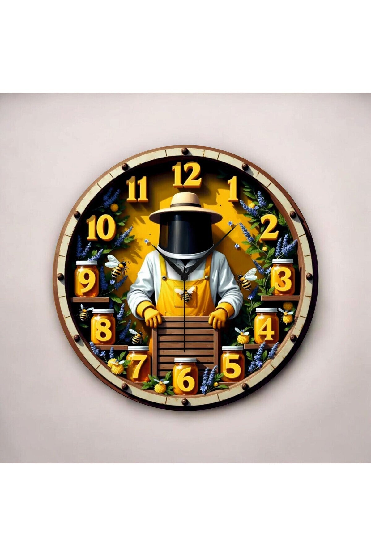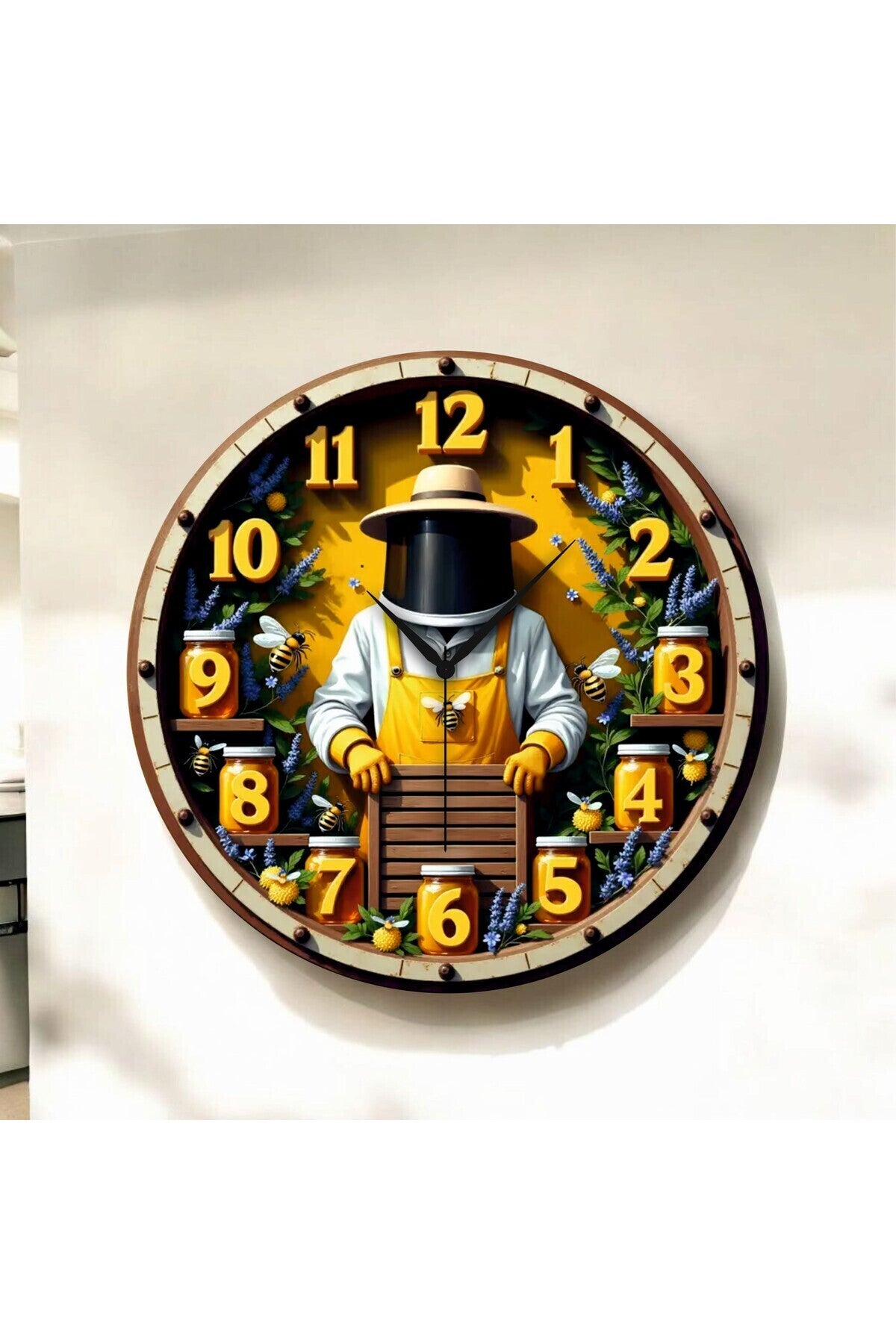 Renkli Baskı Arıcı Bal Desenli Sayılı Hediyelik Ahşap Sessiz Tablo Duvar Saati 45cm