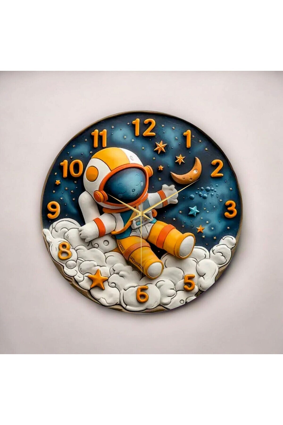 Renkli Baskı Astronot Çocuk Desenli Sayılı Hediyelik Ahşap Sessiz Tablo Duvar Saati 50cm
