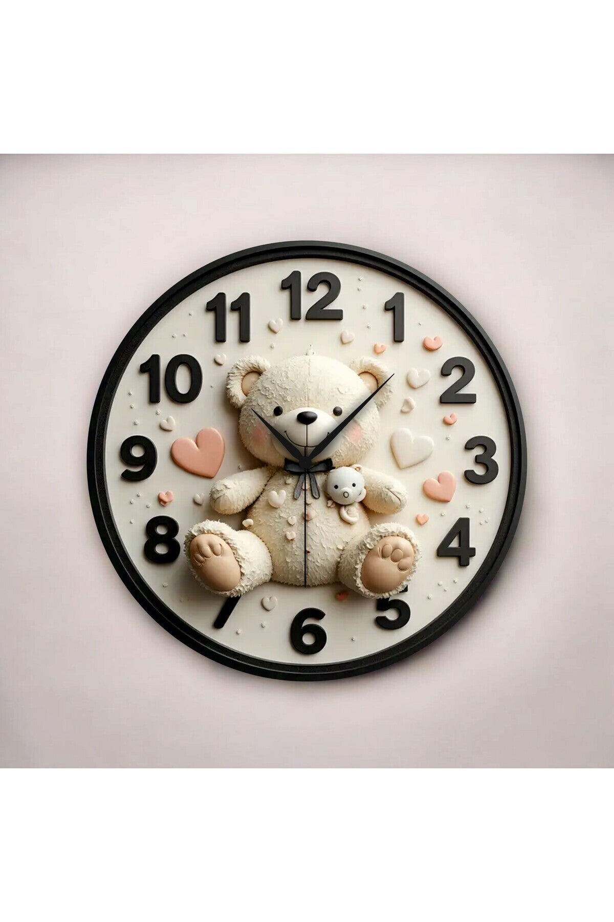 Renkli Baskı Ayıcık Çocuk Desenli Sayılı Hediyelik Ahşap Sessiz Tablo Duvar Saati