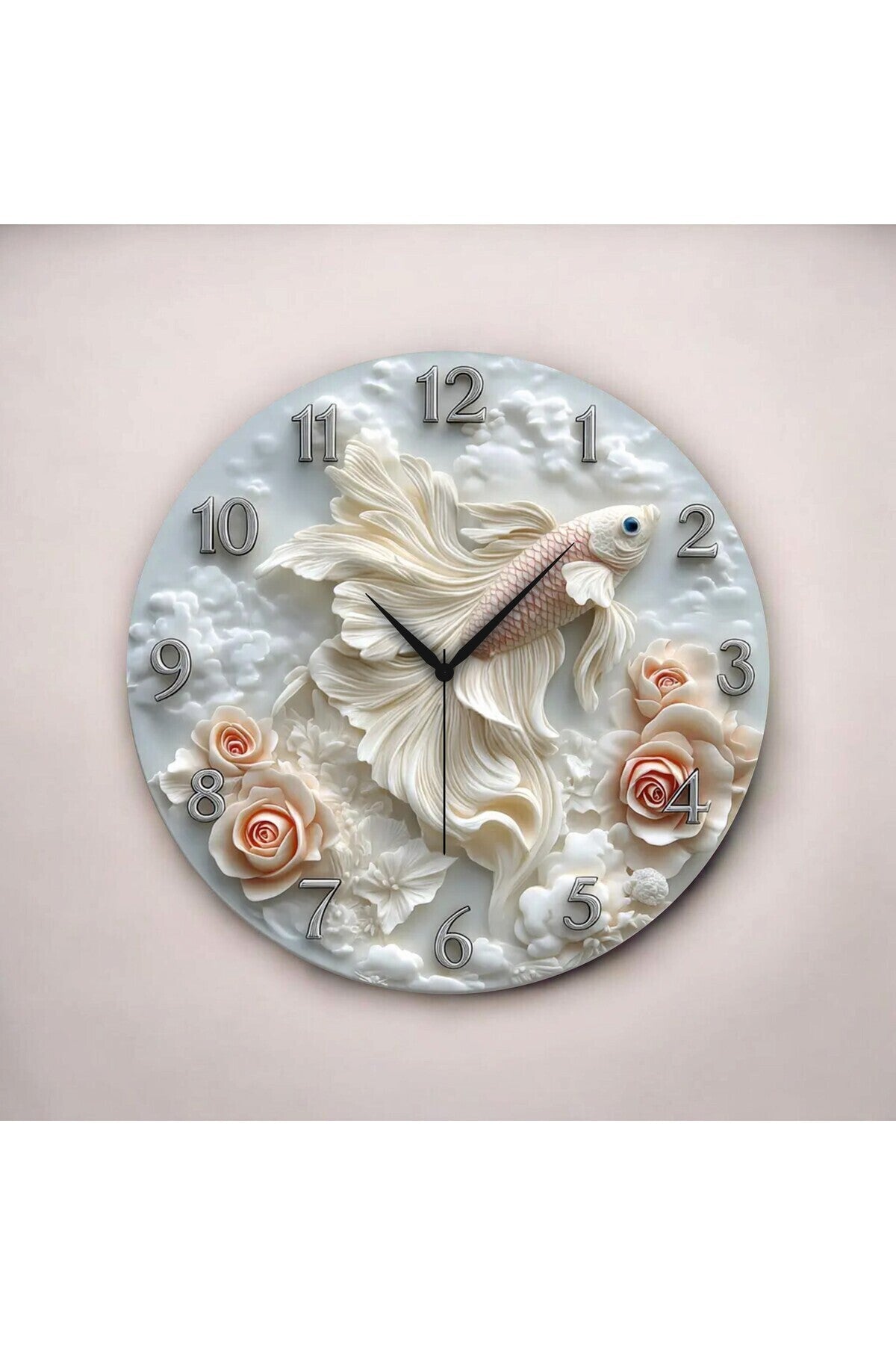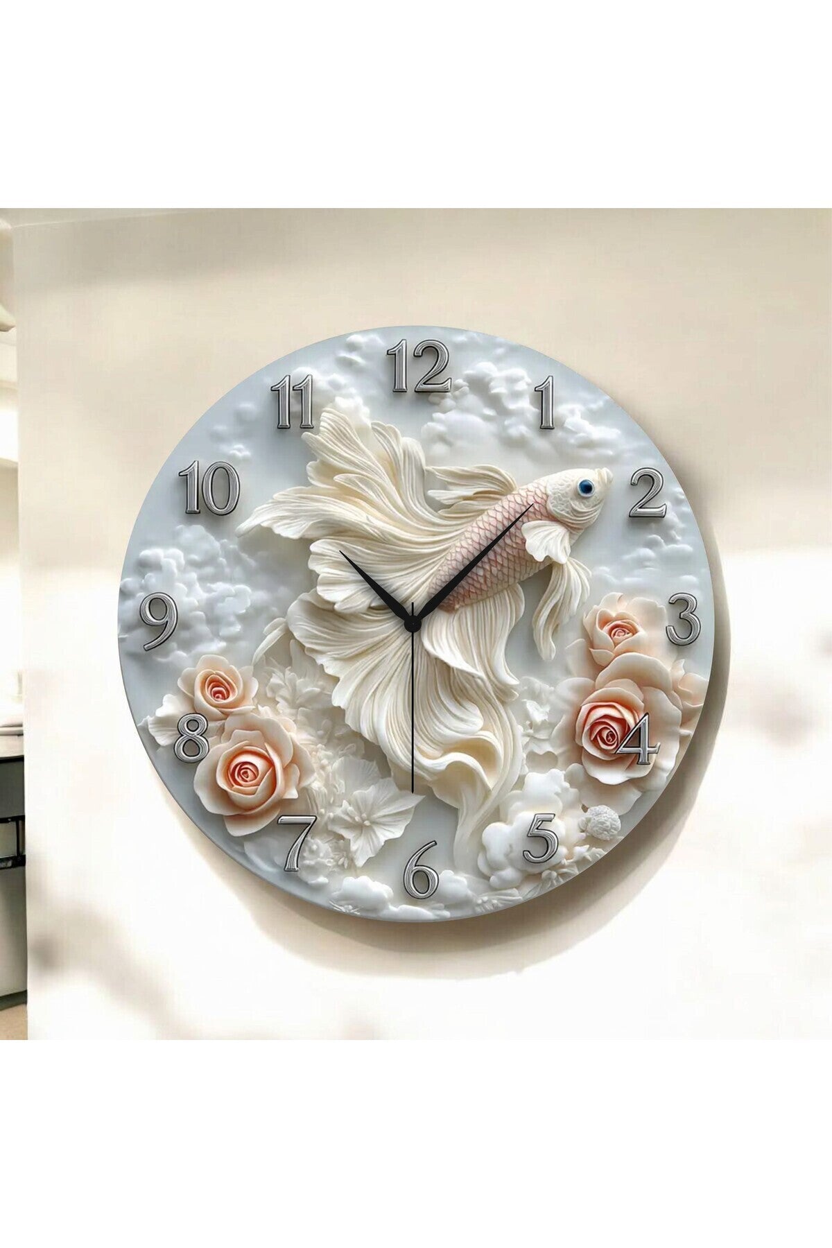 Renkli Baskı Balık Gül Çiçek Desenli Sayılı Hediyelik Ahşap Sessiz Tablo Duvar Saati
