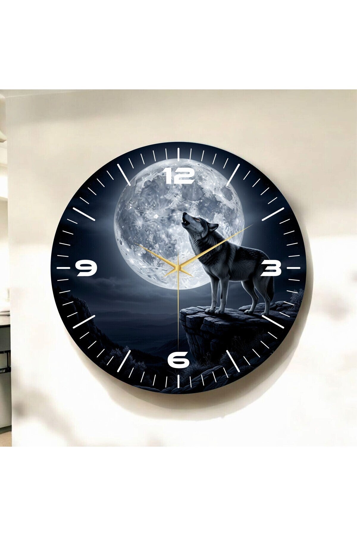 Renkli Baskı Bozkurt ve Ay Desenli Sayılı Hediyelik Ahşap Sessiz Tablo Duvar Saati