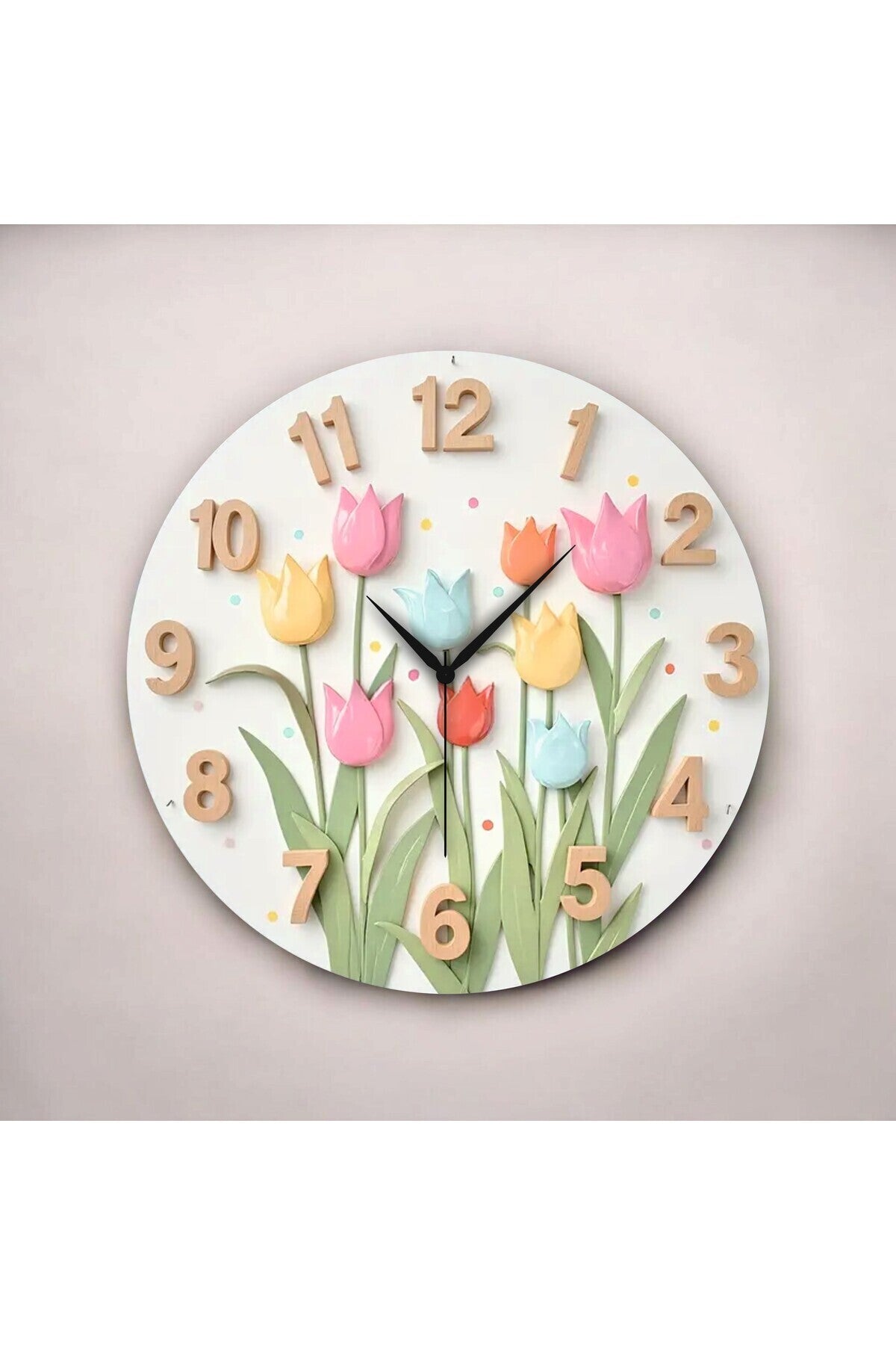 Renkli Baskı Çiçek Desenli Sayılı Hediyelik Ahşap Sessiz Tablo Duvar Saati