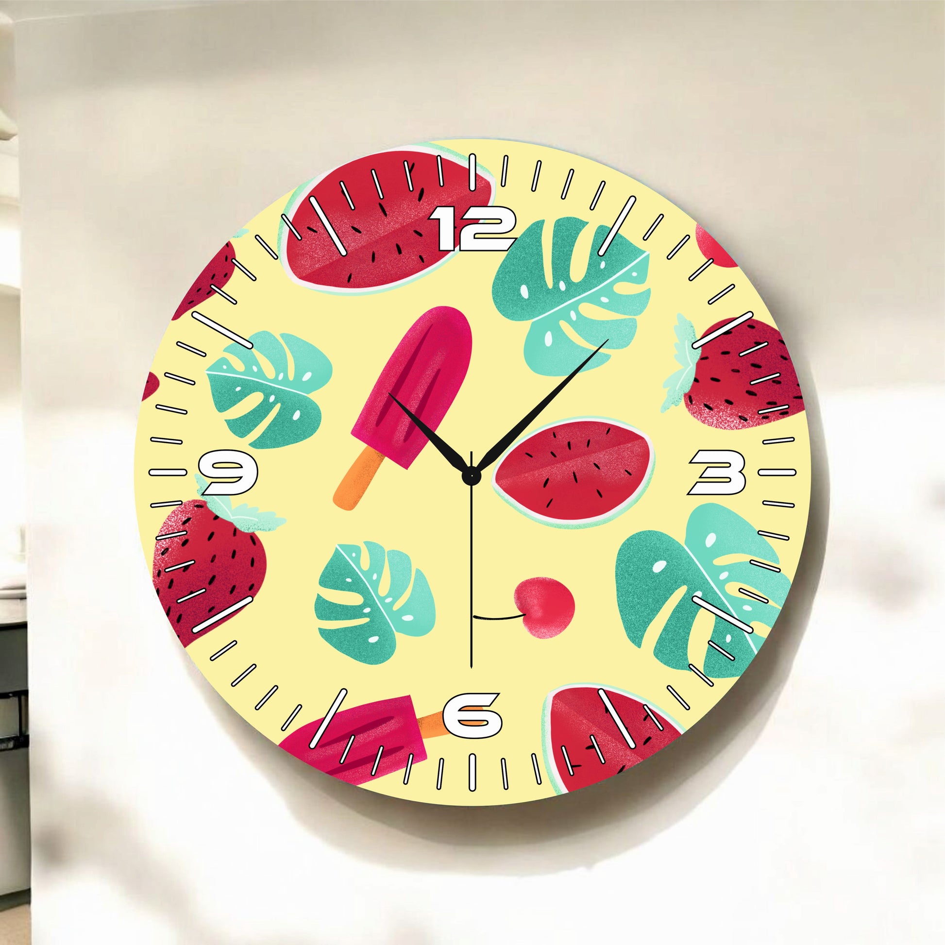 Renkli Baskı Dondurma Karpuz Yaprak Desenli Sayılı Hediyelik Ahşap Sessiz Tablo Duvar Saati