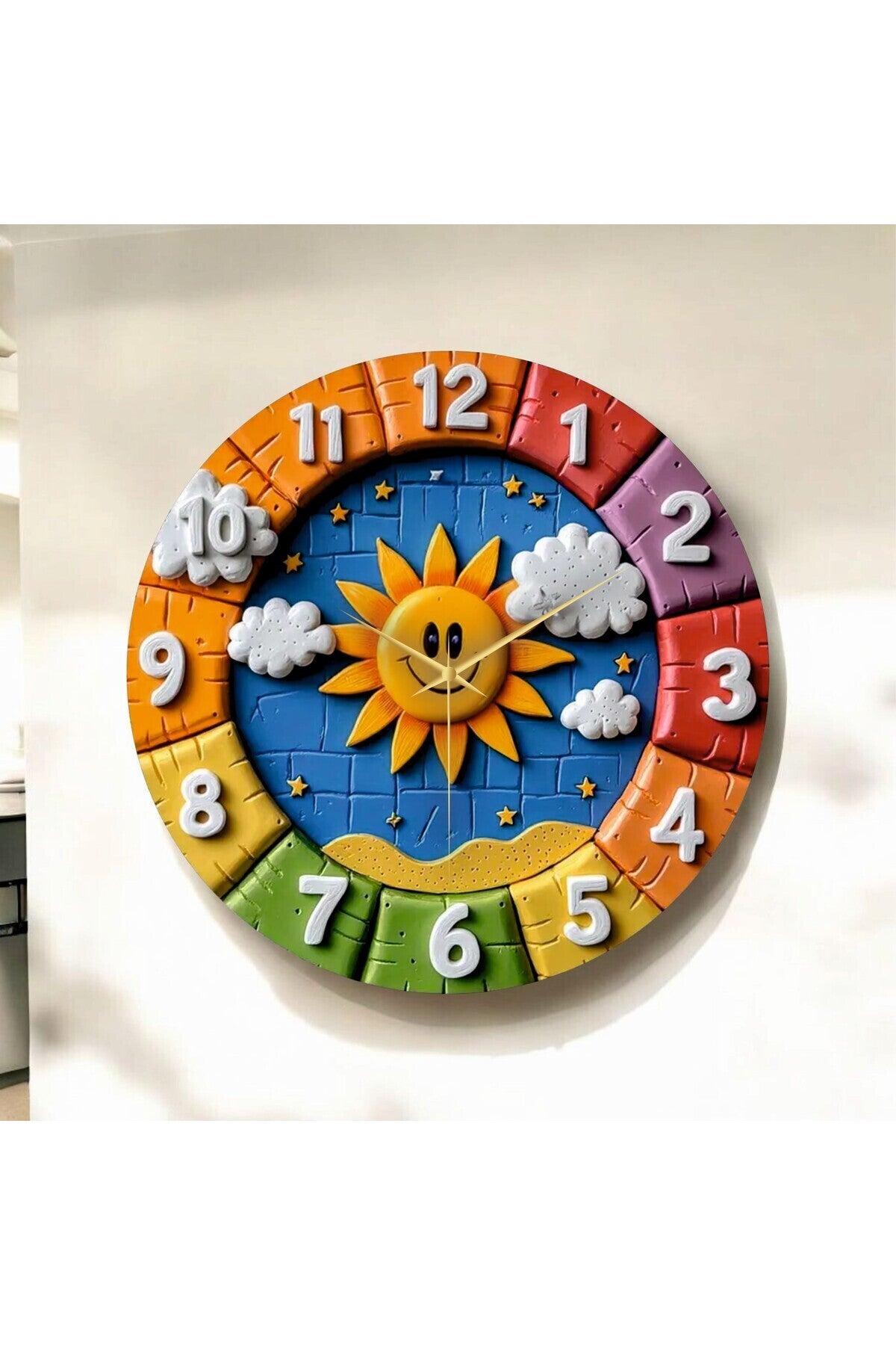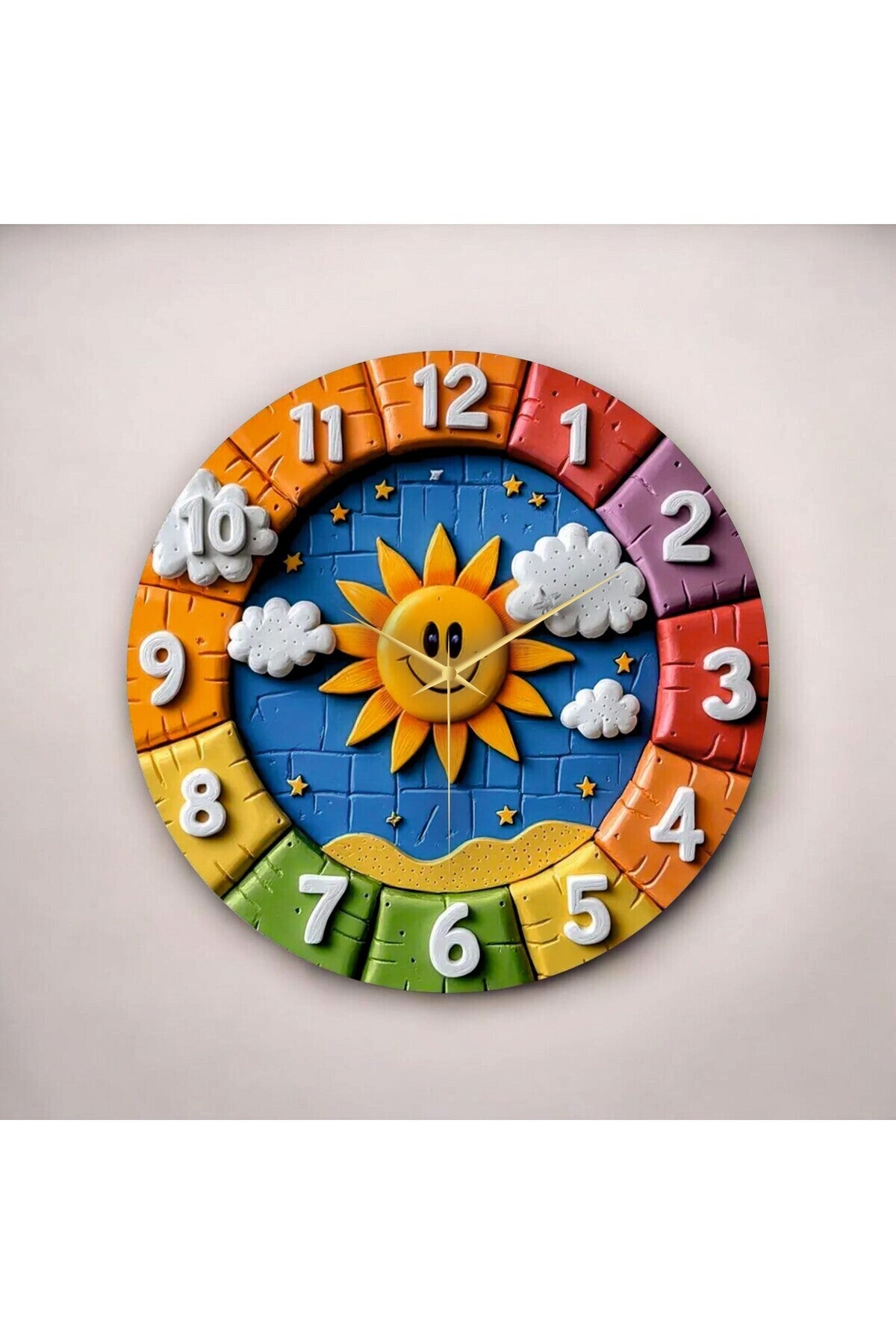 Renkli Baskı Güneş Çocuk Desenli Sayılı Hediyelik Ahşap Sessiz Tablo Duvar Saati