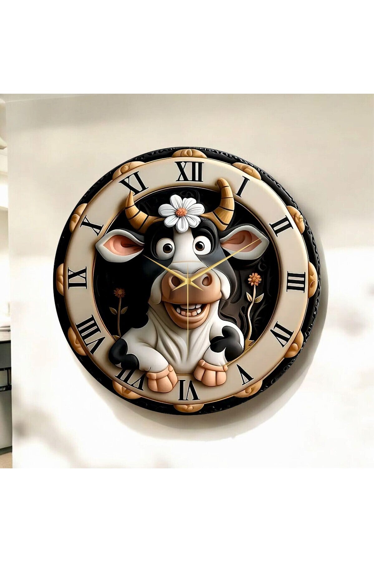 Renkli Baskı İnek Çocuk Desenli Sayılı Hediyelik Ahşap Sessiz Tablo Duvar Saati 50cm