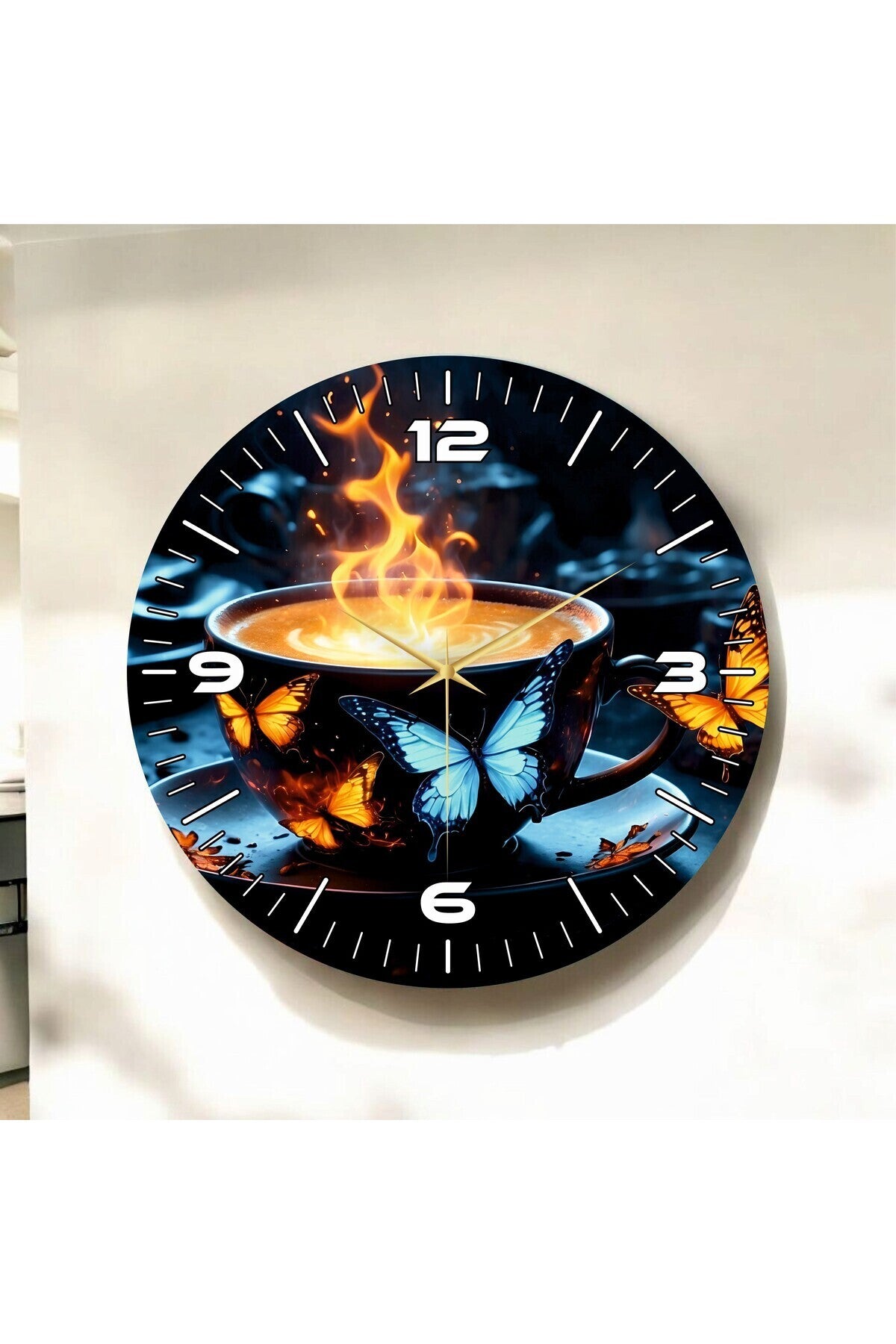 Renkli Baskı Kahve Kelebek Desenli Sayılı Hediyelik Ahşap Sessiz Tablo Duvar Saati 50cm