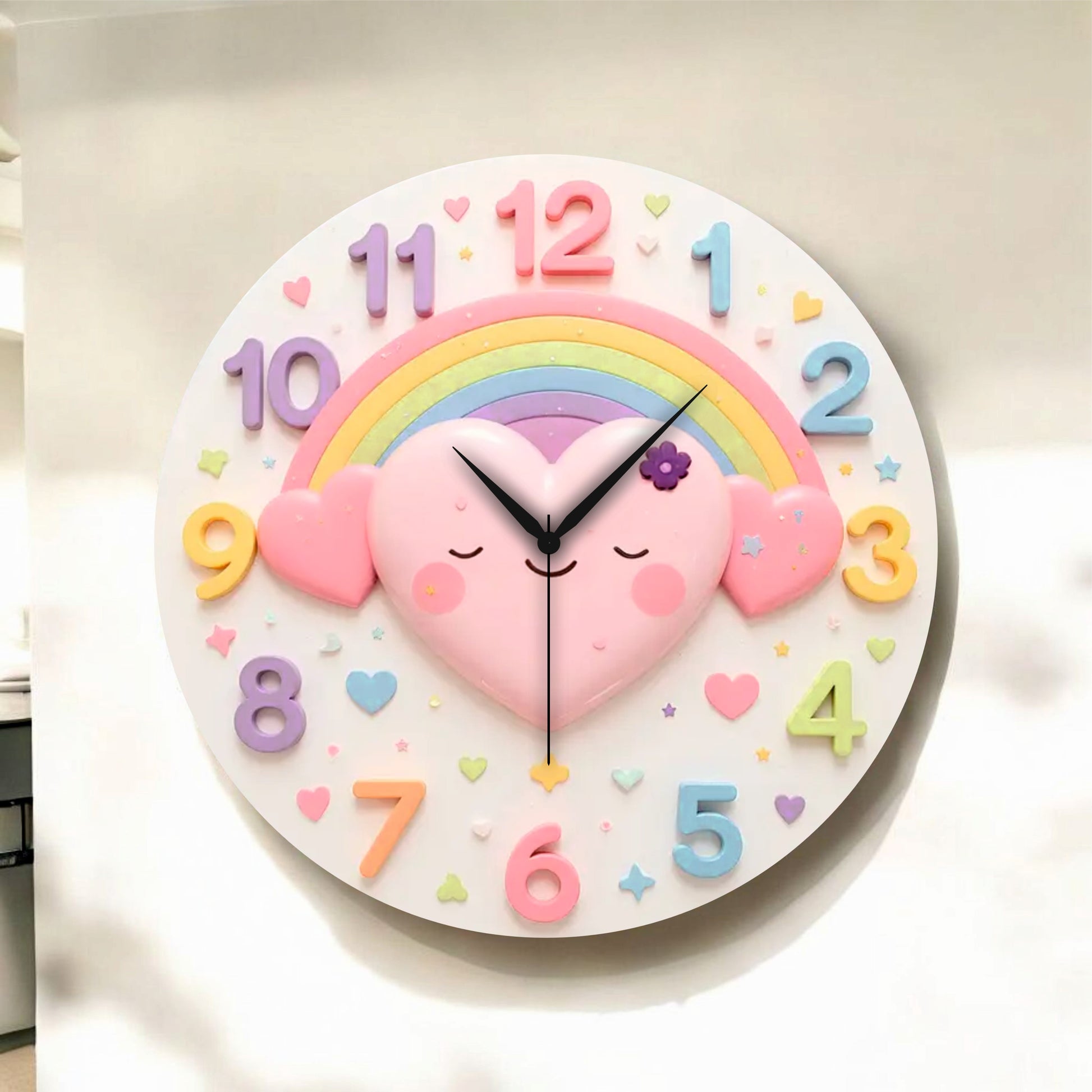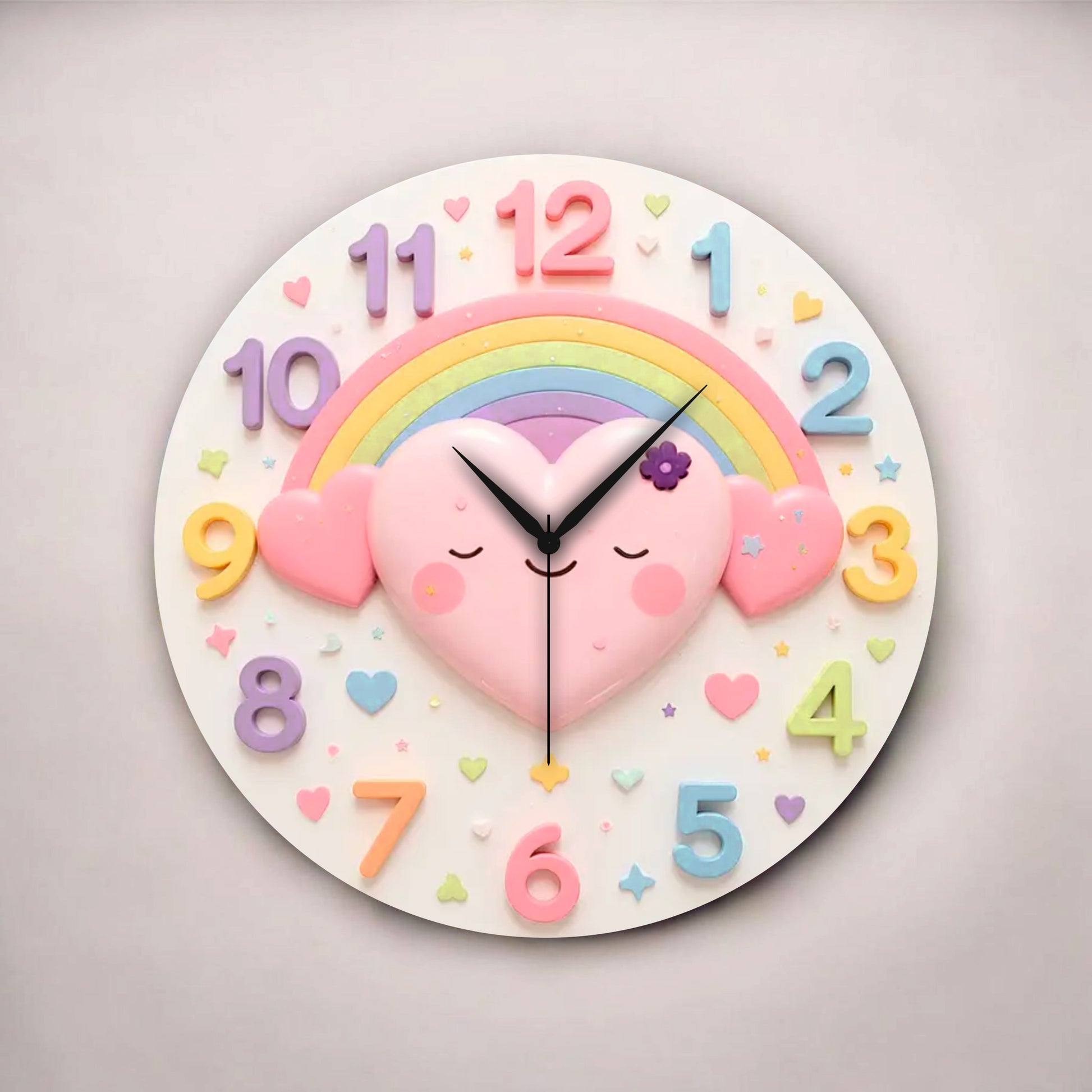 Renkli Baskı Kalp Çocuk Desenli Sayılı Hediyelik Ahşap Sessiz Tablo Duvar Saati