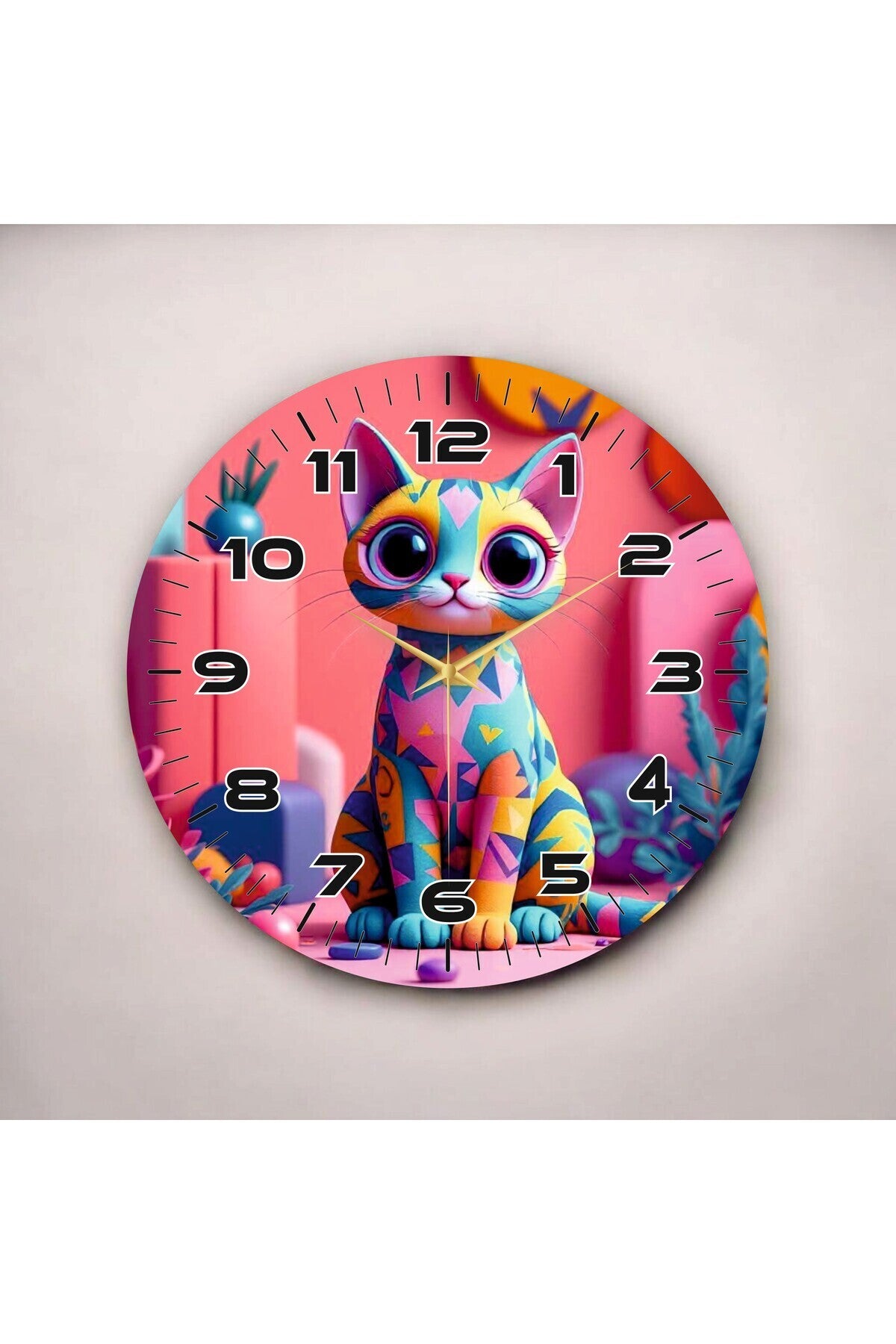 - Modern tasarımıyla dikkat çeken renkli kedi hayvan desenleri, evinizin dekorasyonuna şıklık katıyor.; - 45cm çapında geniş ekranı sayesinde zamanı kolayca okuyabilirsiniz; sessiz çalışma tipi ile gürültüsüz bir kullanım sunar.; - Çok renkli web color özelliğiyle canlı ve göz alıcı bir görünüm sağlar, mekanınıza enerji katar.; - Pilli çalışma sistemi ile pratiklik kazandırırken, herhangi bir elektrik bağlantısına ihtiyaç duymadan kullanabilirsiniz.; - Modern tema ve stil anlayışıyla çağdaş yaşam alanlarına uyum sağlar; hem işlevsel hem de estetik bir aksesuar olarak öne çıkar.; - Ahşap malzemesi doğal dokusuyla sıcaklık hissi verirken dayanıklılığıyla uzun süreli kullanım vaat eder.; - Yuvarlak şekli sayesinde çeşitli yüzeylere kolayca monte edilebilir ve yerleştirildiği ortama zarif bir dokunuş ekler.