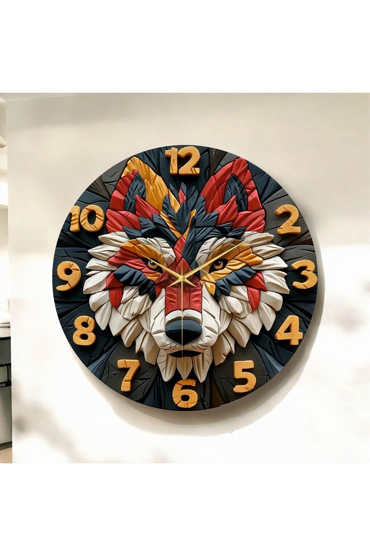 Renkli Baskı Kurt Hayvan Desenli Sayılı Hediyelik Ahşap Sessiz Tablo Duvar Saati