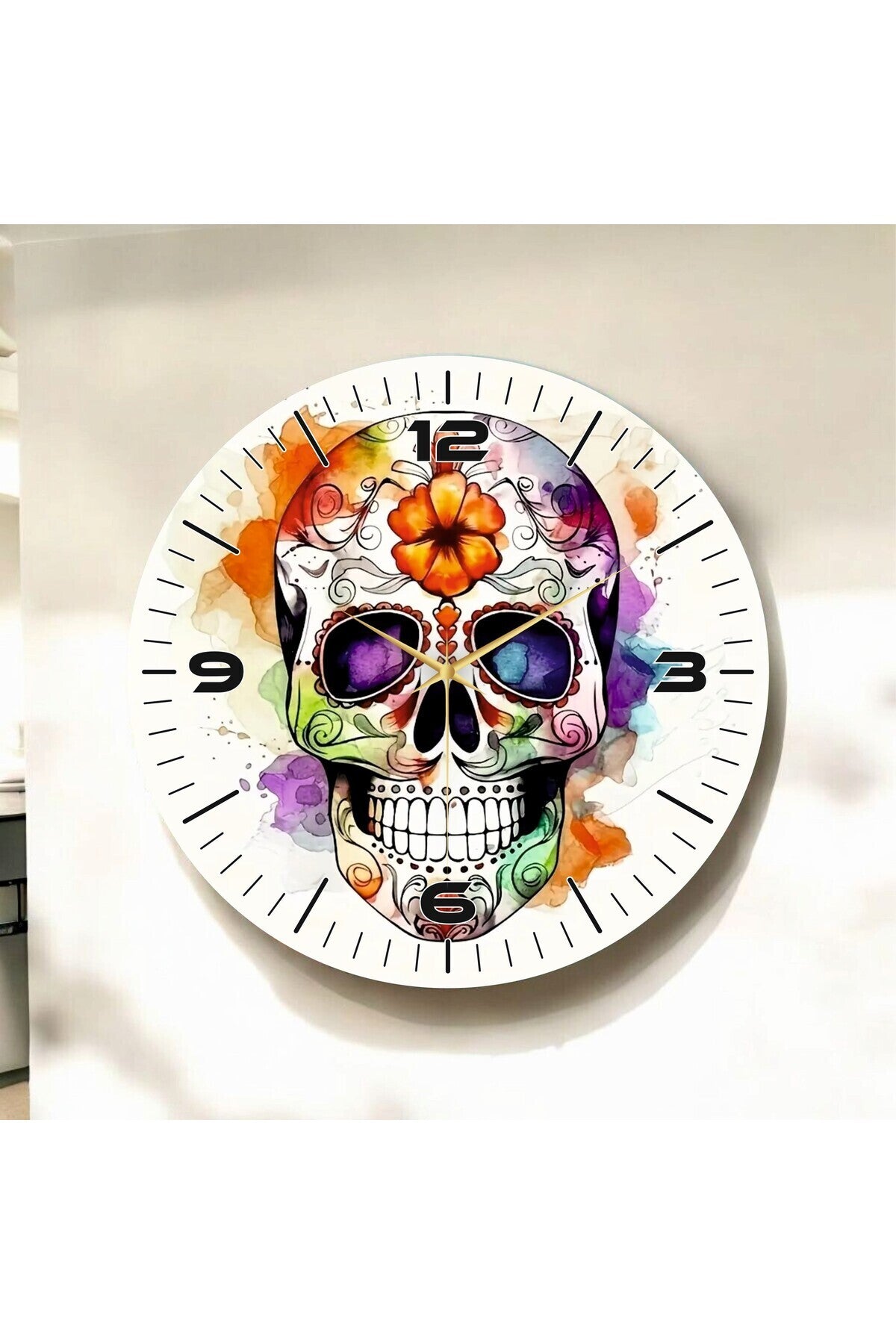 Renkli Baskı Kuru Kafa Desenli Sayılı Hediyelik Ahşap Sessiz Tablo Duvar Saati