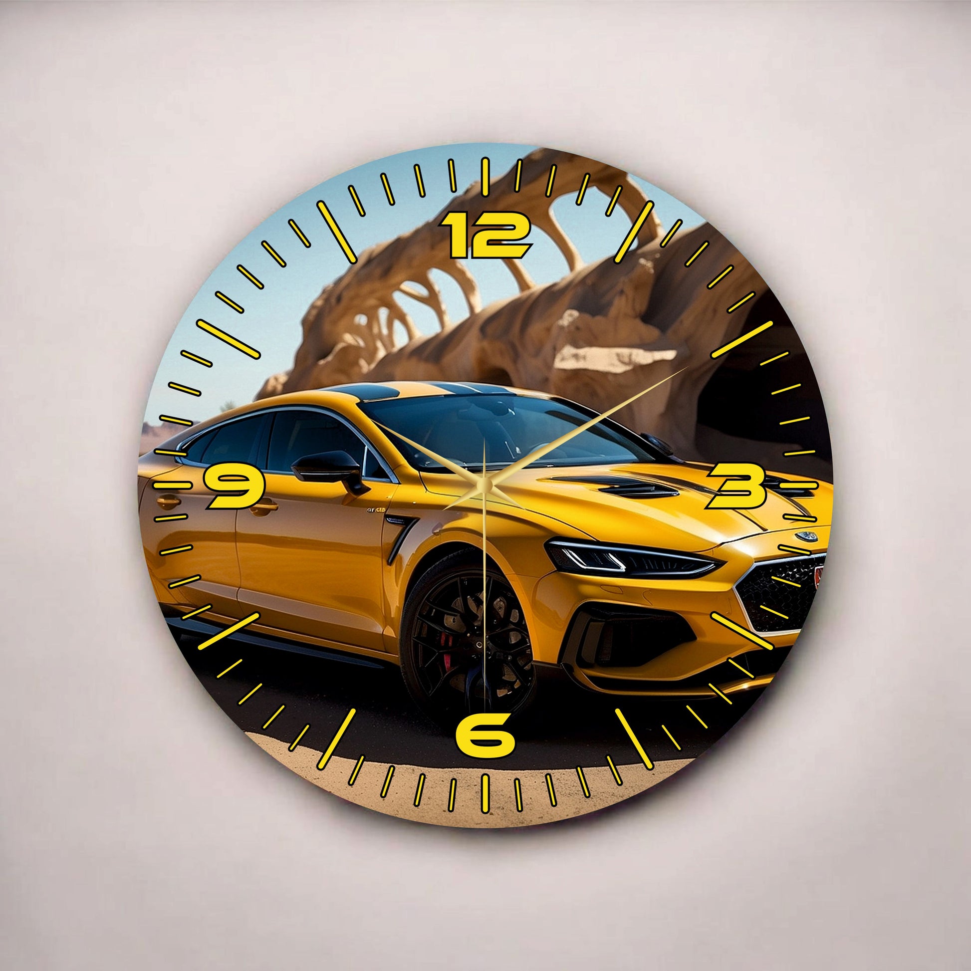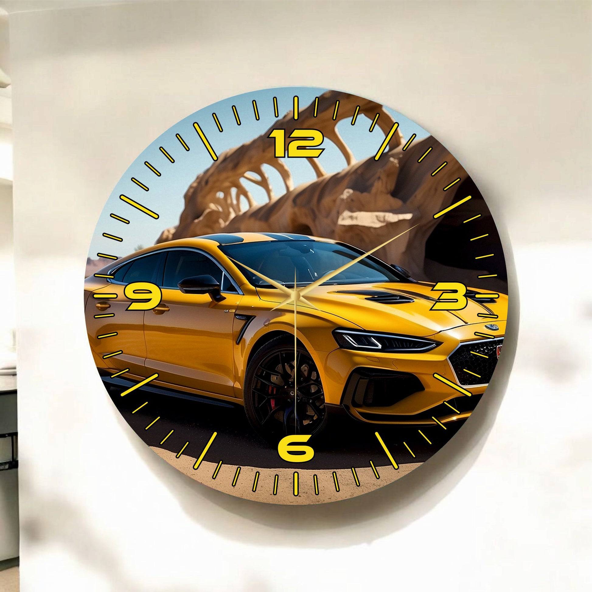 Renkli Baskı Sarı Araba Desenli Sayılı Hediyelik Ahşap Sessiz Tablo Duvar Saati