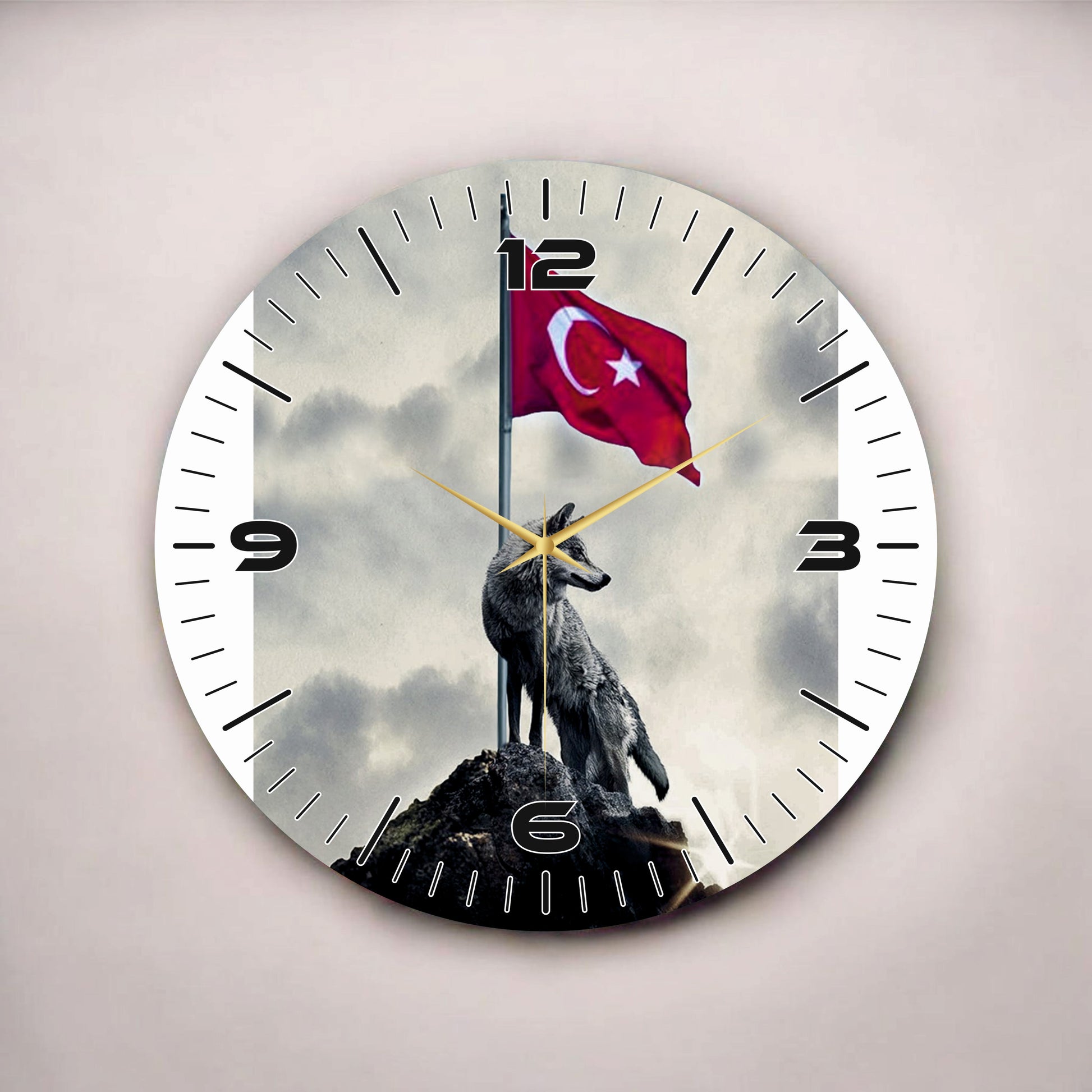 Renkli Baskı Türk Bayrağı ve Bozkurt Desenli Sayılı Hediyelik Ahşap Sessiz Tablo Duvar Saati