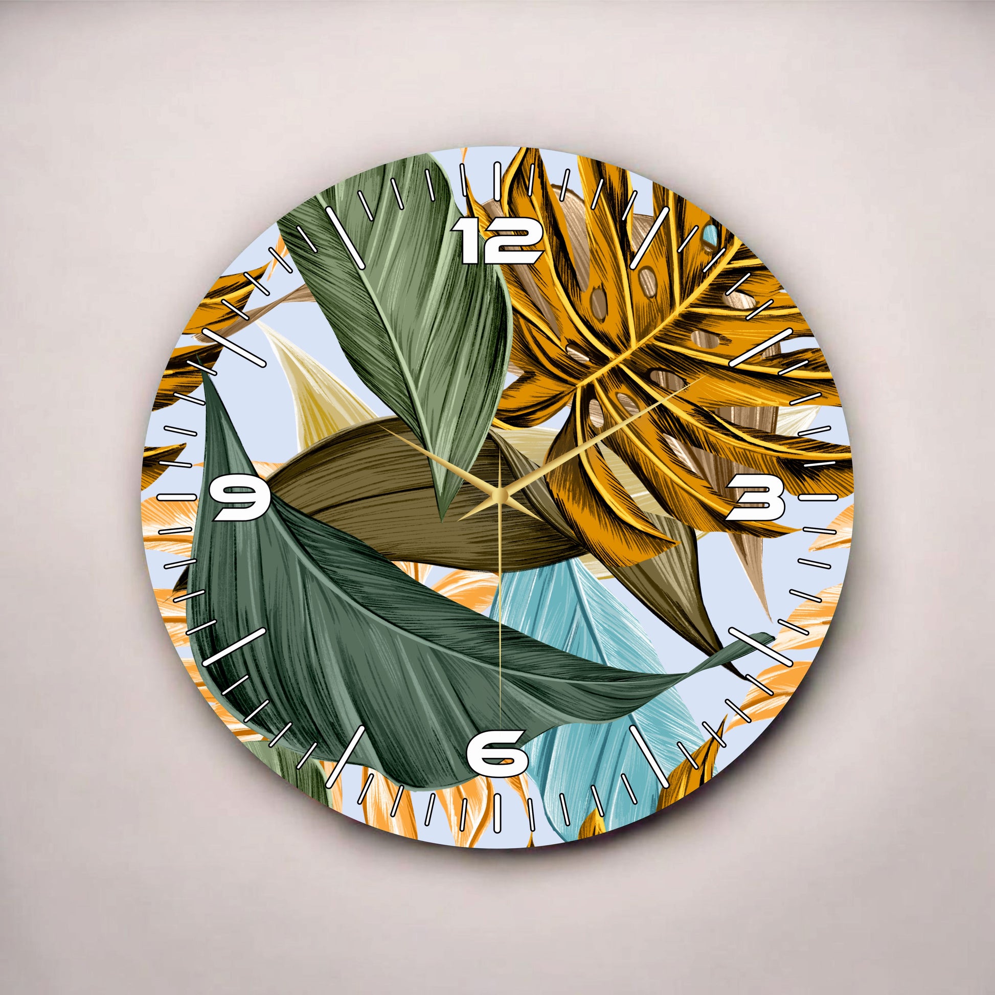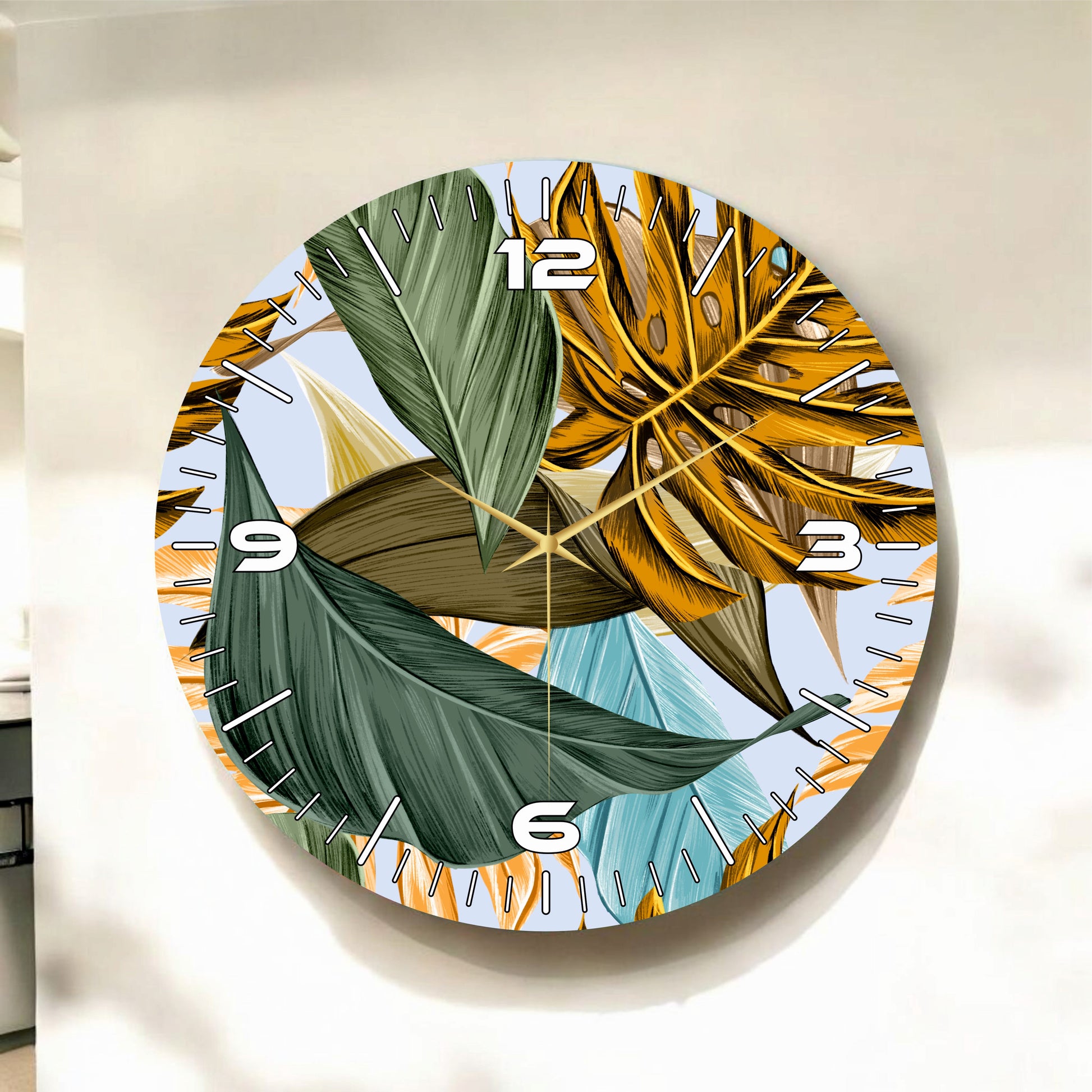 Renkli Baskı Yaprak Çiçek Desenli Sayılı Hediyelik Ahşap Sessiz Tablo Duvar Saati 45cm