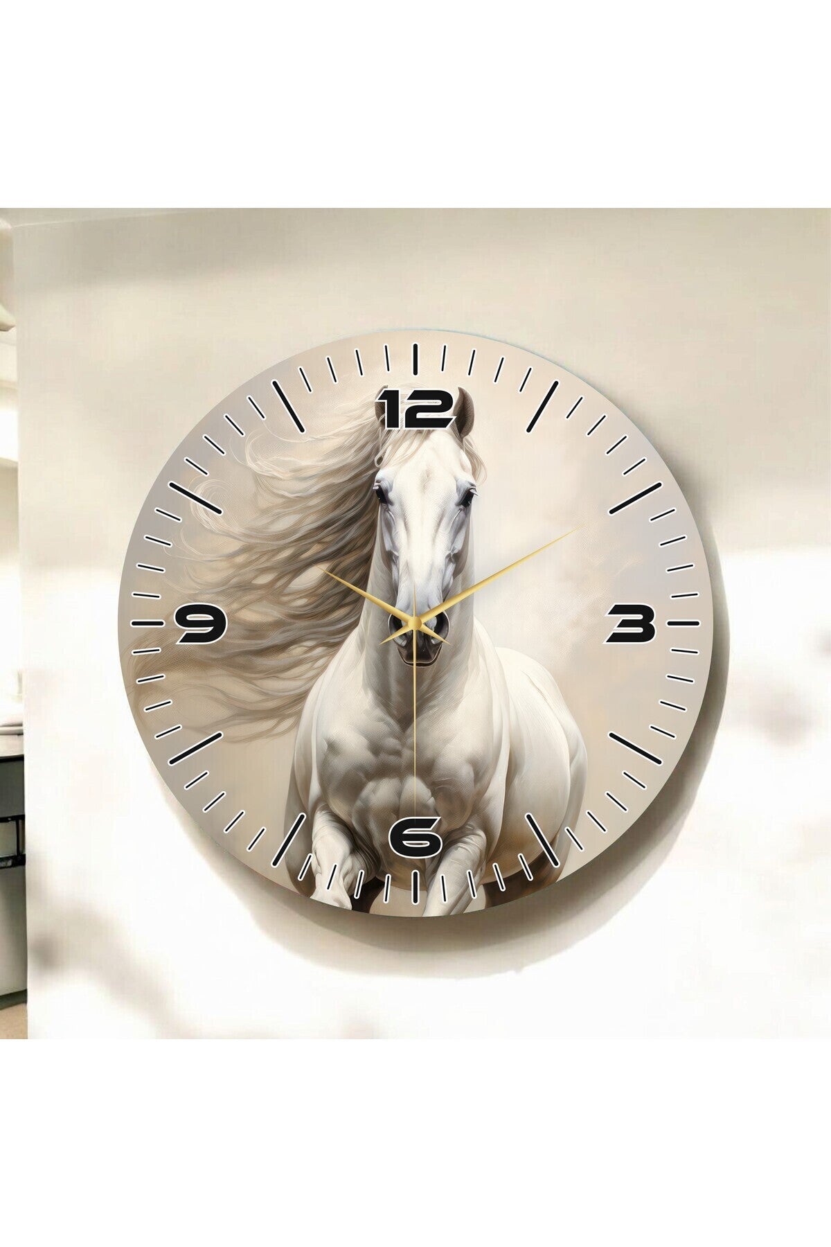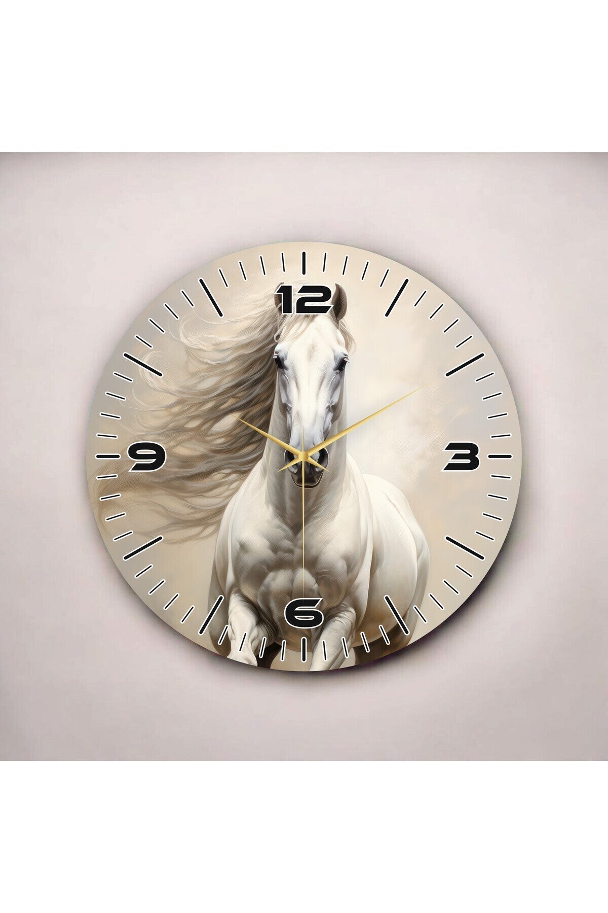 Şık Beyaz Renkli At Baskılı Hayvan Desenli Sayılı Hediyelik Ahşap Sessiz Tablo Duvar Saati