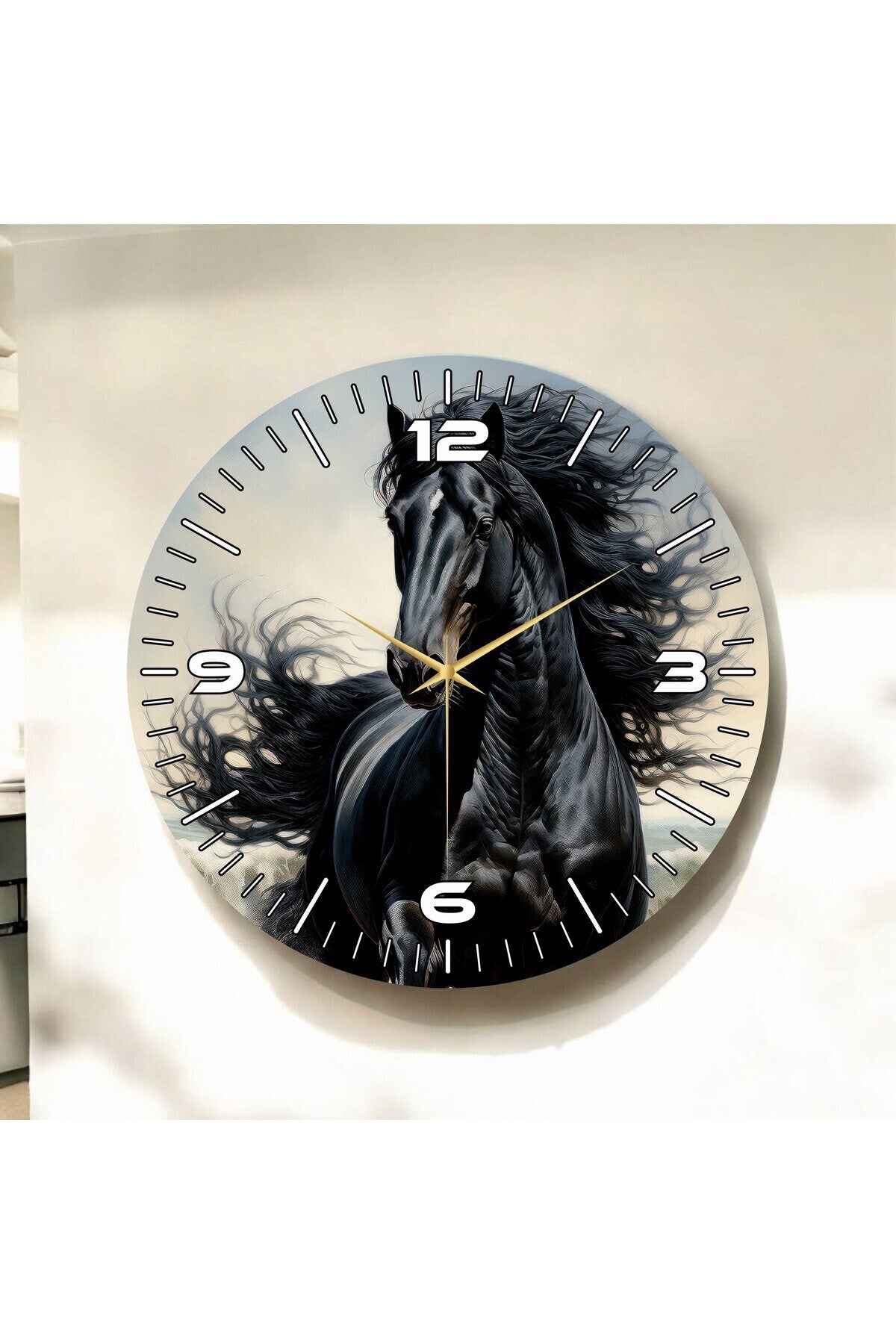 Siyah At Renkli Baskı Hayvan Desenli Sayılı Hediyelik Ahşap Sessiz Tablo Duvar Saati