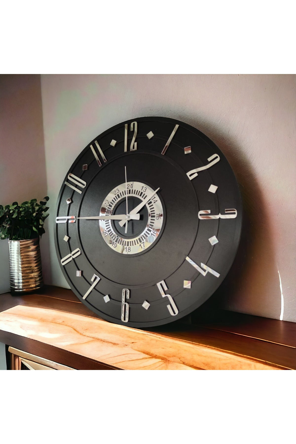 Siyah Renk Gümüş Sayılı Hediyelik Ahşap Dekoratif Farklı Desenli Ev Hediyelik Duvar Saati 50cm