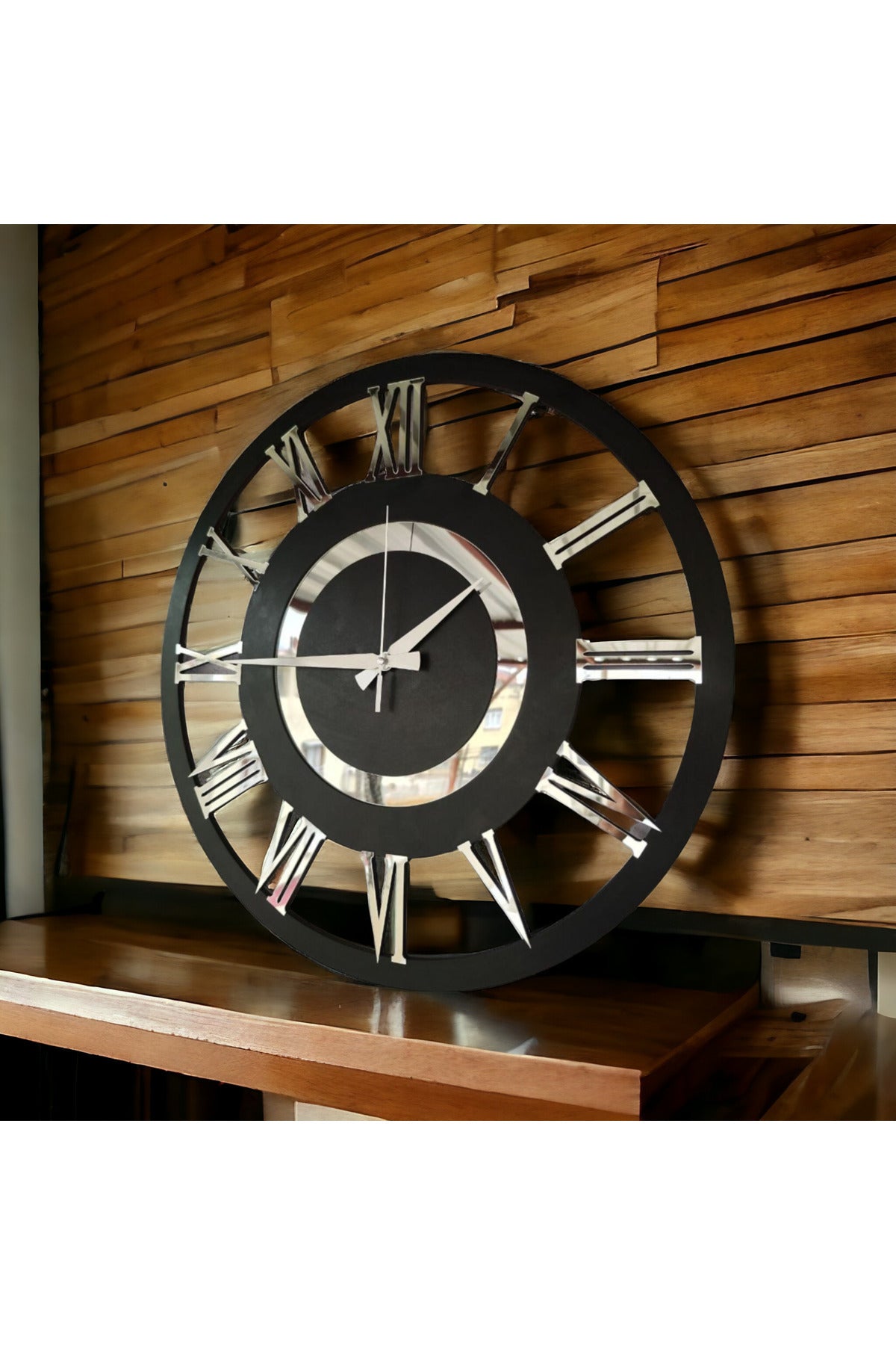 Siyah Renk Gümüş Sayılı Hediyelik Ahşap Dekoratif Farklı Desenli Ev Hediyelik Duvar Saati 50cm
