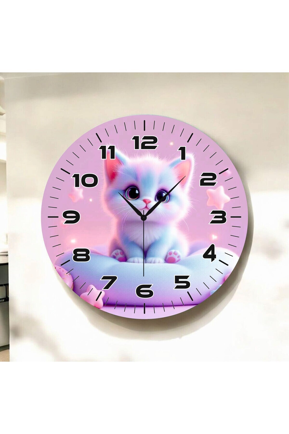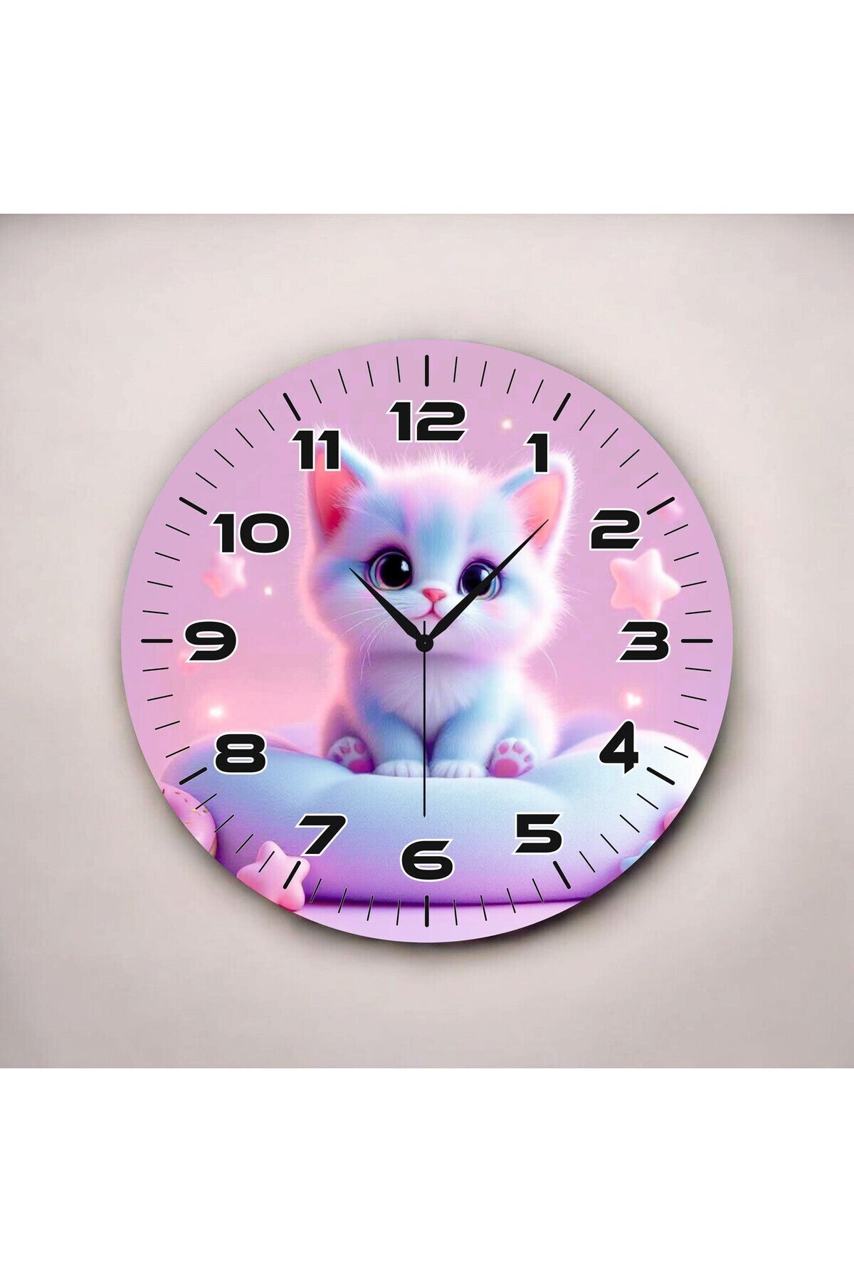 Yavru Kedi Pembe Renkli Baskı Desenli Sayılı Hediyelik Ahşap Sessiz Tablo Duvar Saati