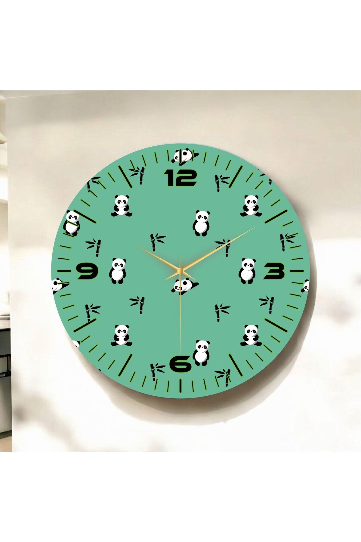 Yeşil Renkli Baskı Panda Çocuk Desenli Sayılı Hediyelik Ahşap Sessiz Tablo Duvar Saati